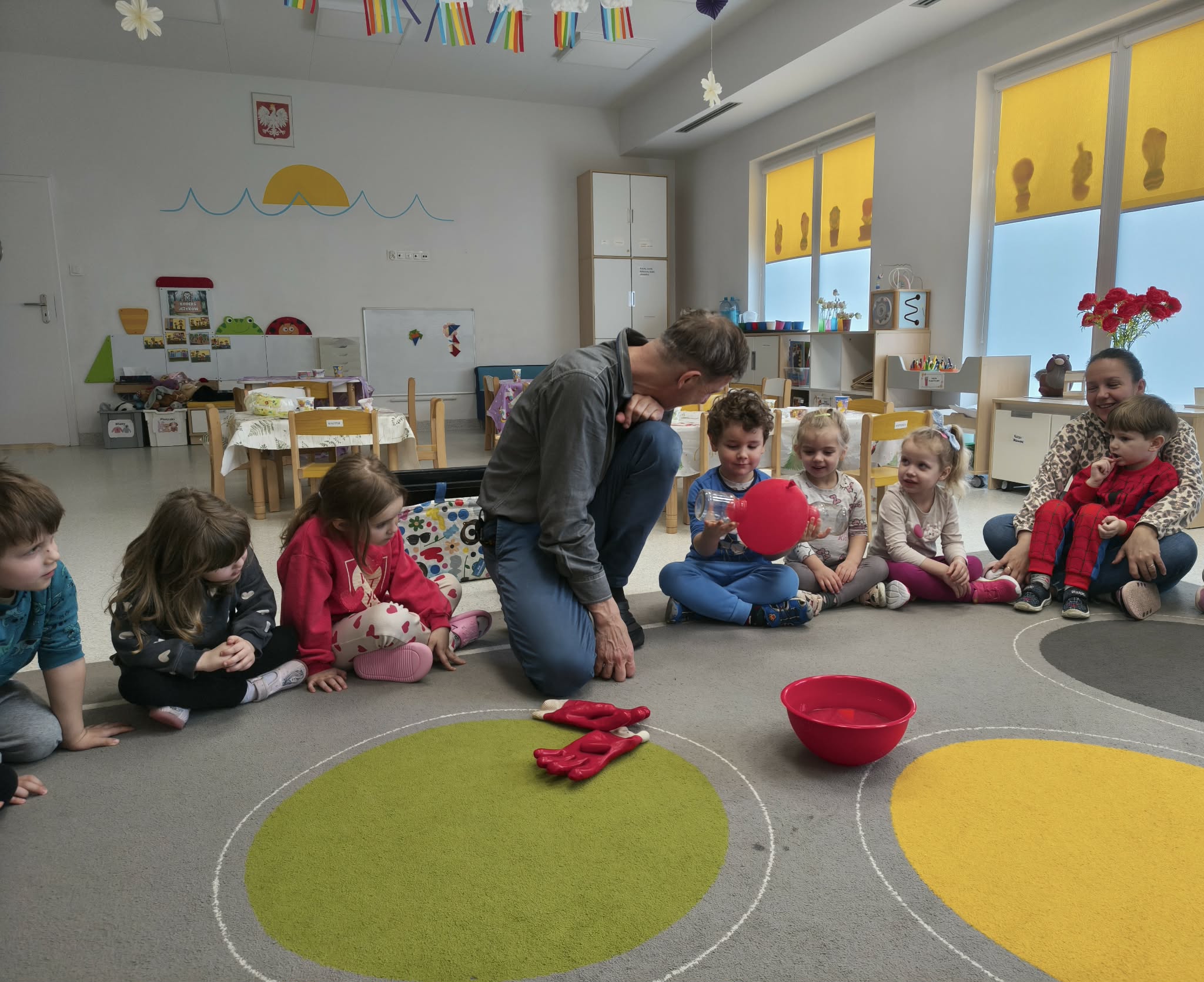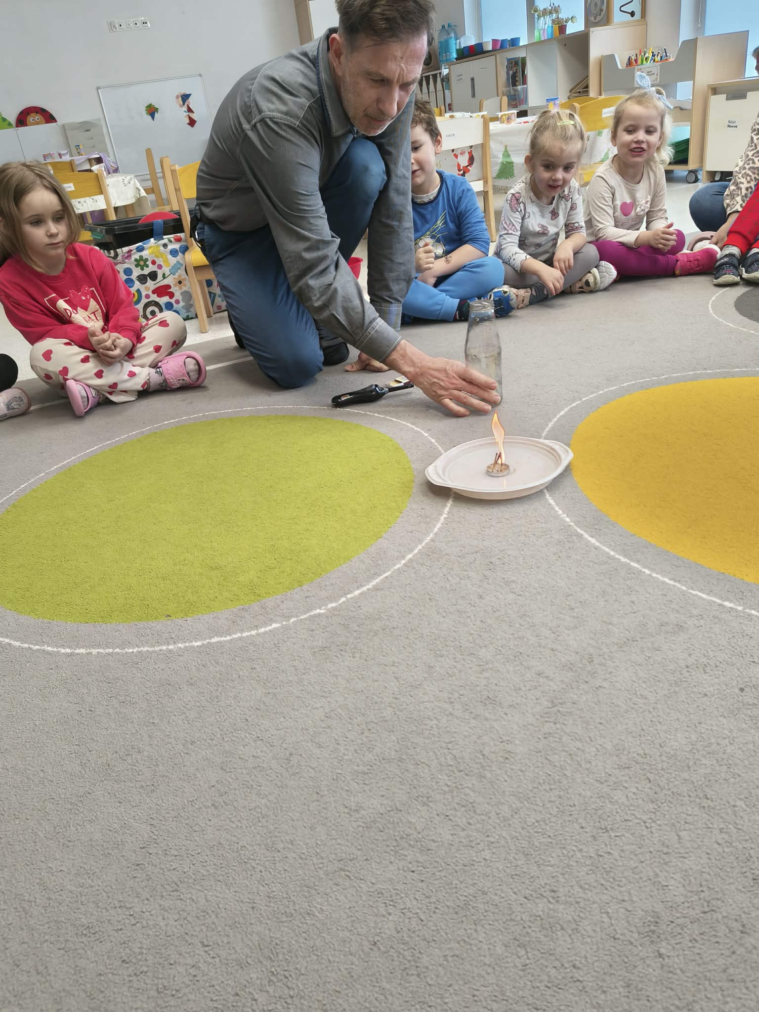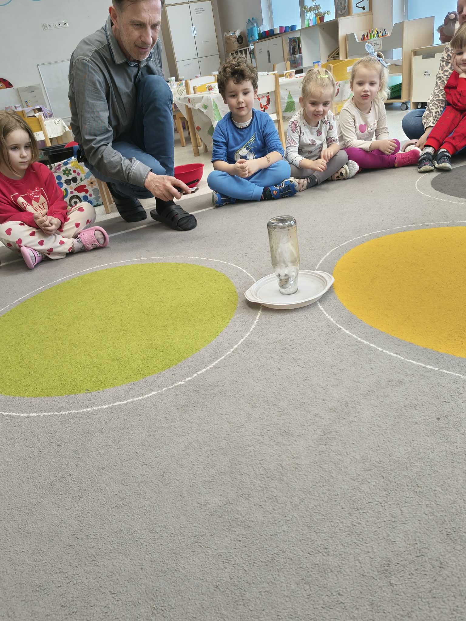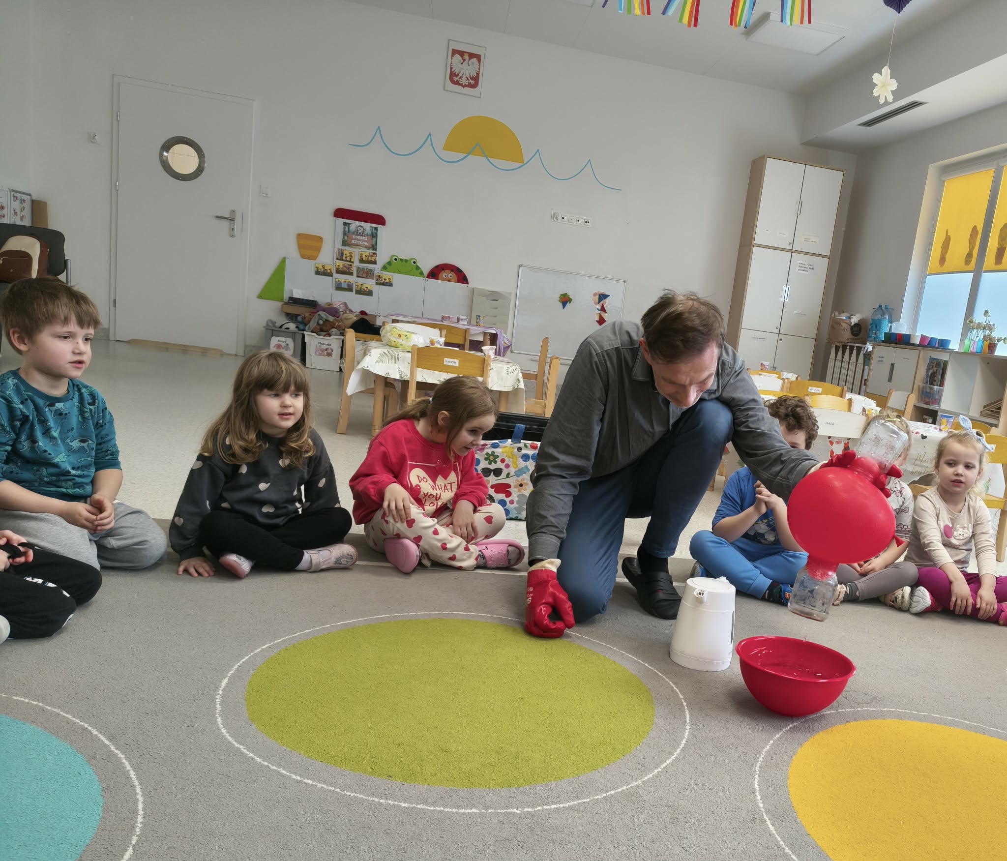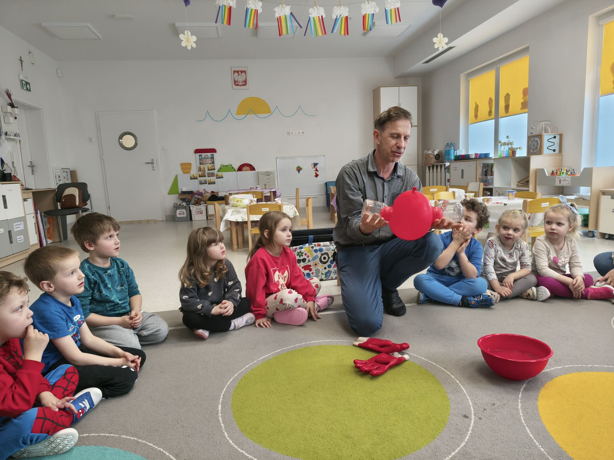 W naszym przedszkolu odbyły się niezwykle ciekawe zajęcia eksperymentalne z Panem Krzysztofem, podczas których dzieci mogły wcielić się w rolę małych naukowców. Razem odkrywaliśmy tajemnice powietrza i poznawaliśmy fascynujące zjawiska fizyczne. Podczas zajęć przedszkolaki dowiedziały się czym jest powietrze, czy można je zobaczyć oraz ile waży. Dzieci z dużym zainteresowaniem obserwowały doświadczenia pokazujące ciśnienie powietrza oraz próżnię. Największe emocje wzbudziły eksperymenty związane z eksplozją i implozją, które w bezpieczny i ciekawy sposób pokazały, jak ogromną siłę może mieć powietrze i zmiany ciśnienia. Było dużo zdziwienia, radości i naukowych odkryć! Zajęcia były doskonałą okazją do rozwijania ciekawości świata, zadawania pytań oraz wspólnego odkrywania, jak działa otaczający nas świat. To była prawdziwa naukowa przygoda, którą dzieci zapamiętają na długo!