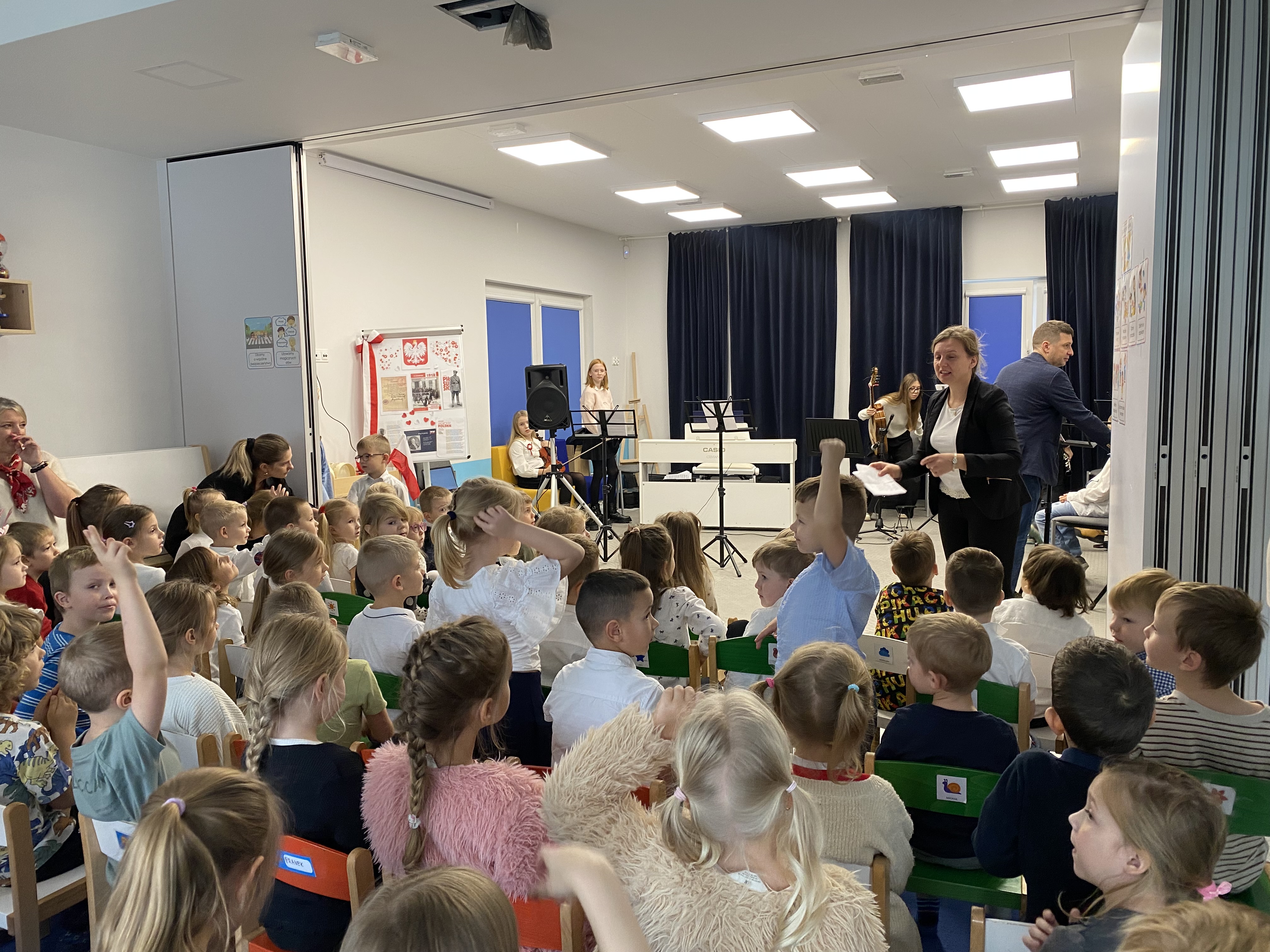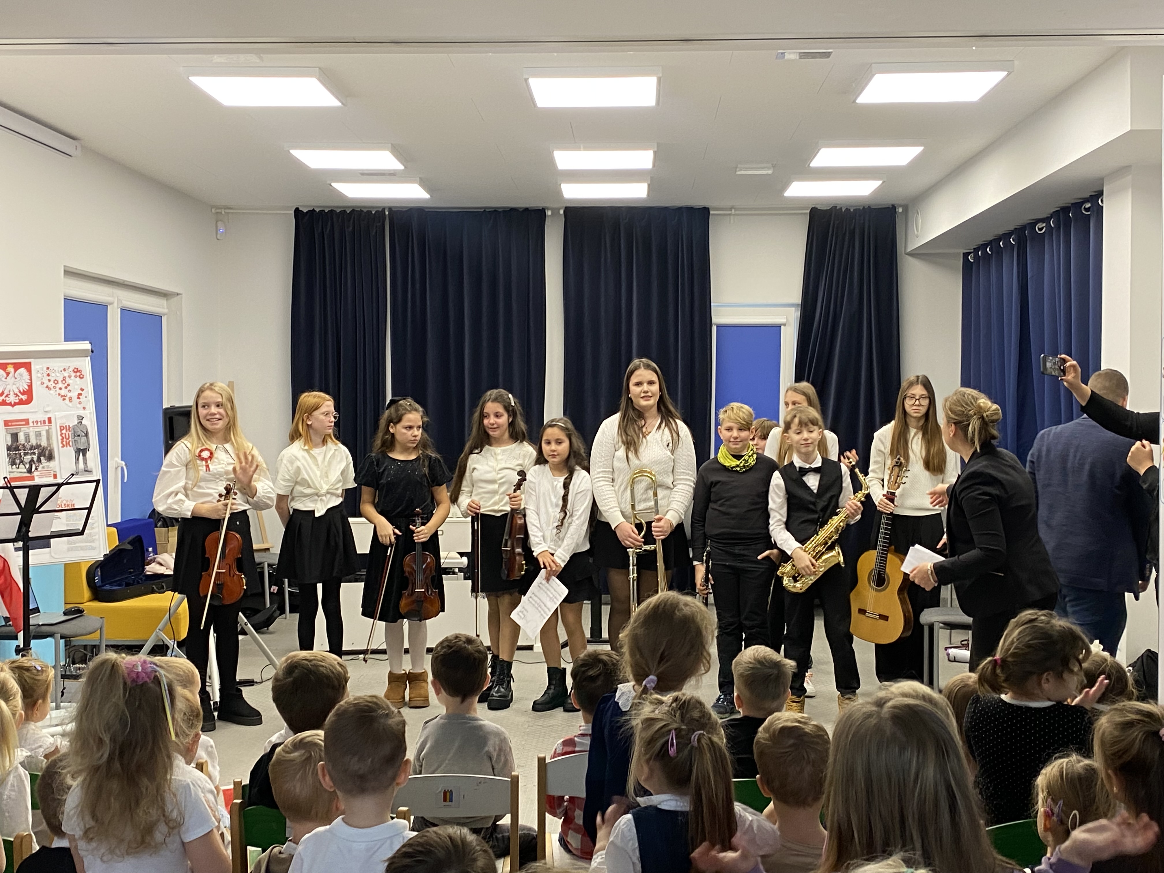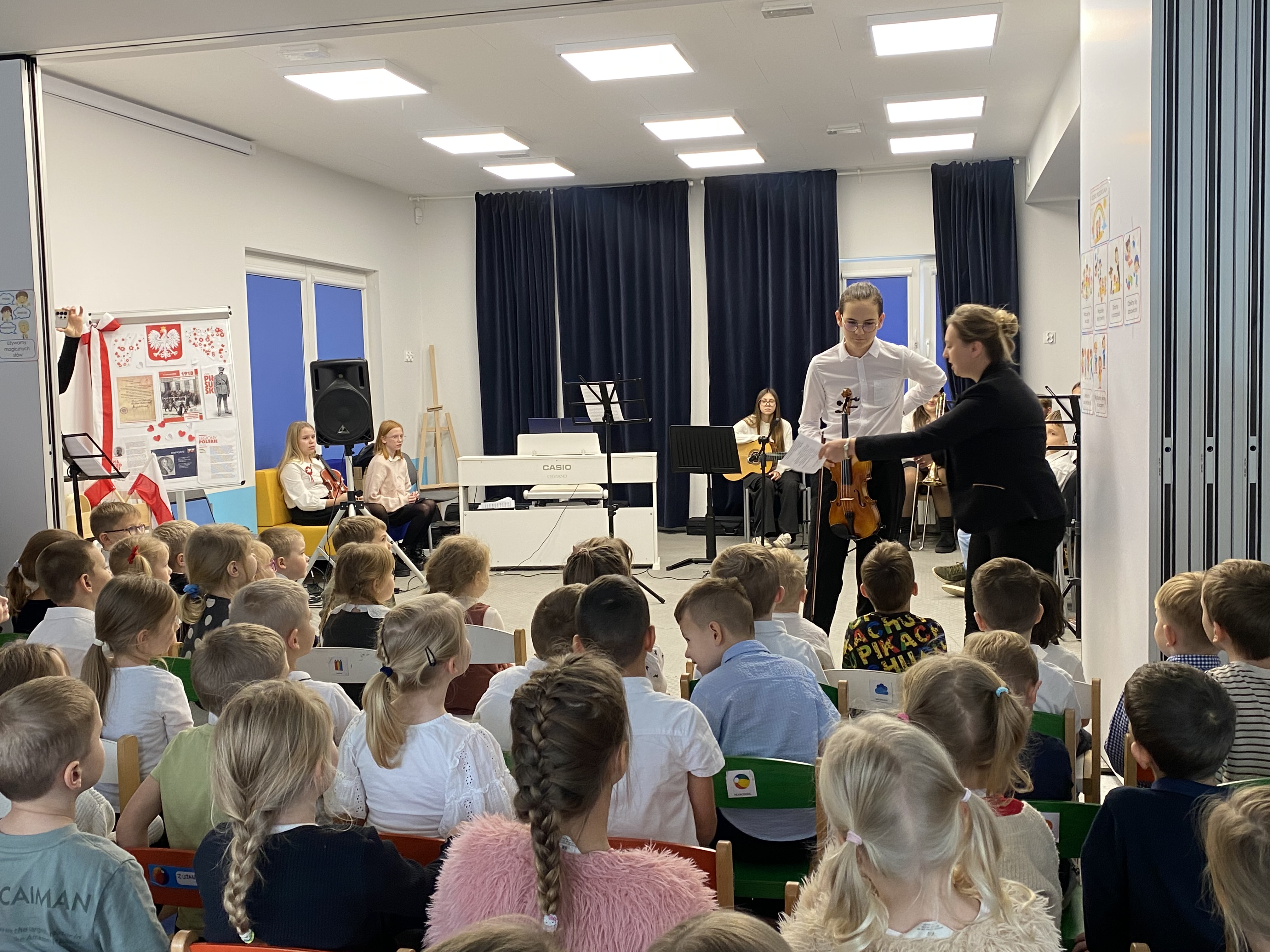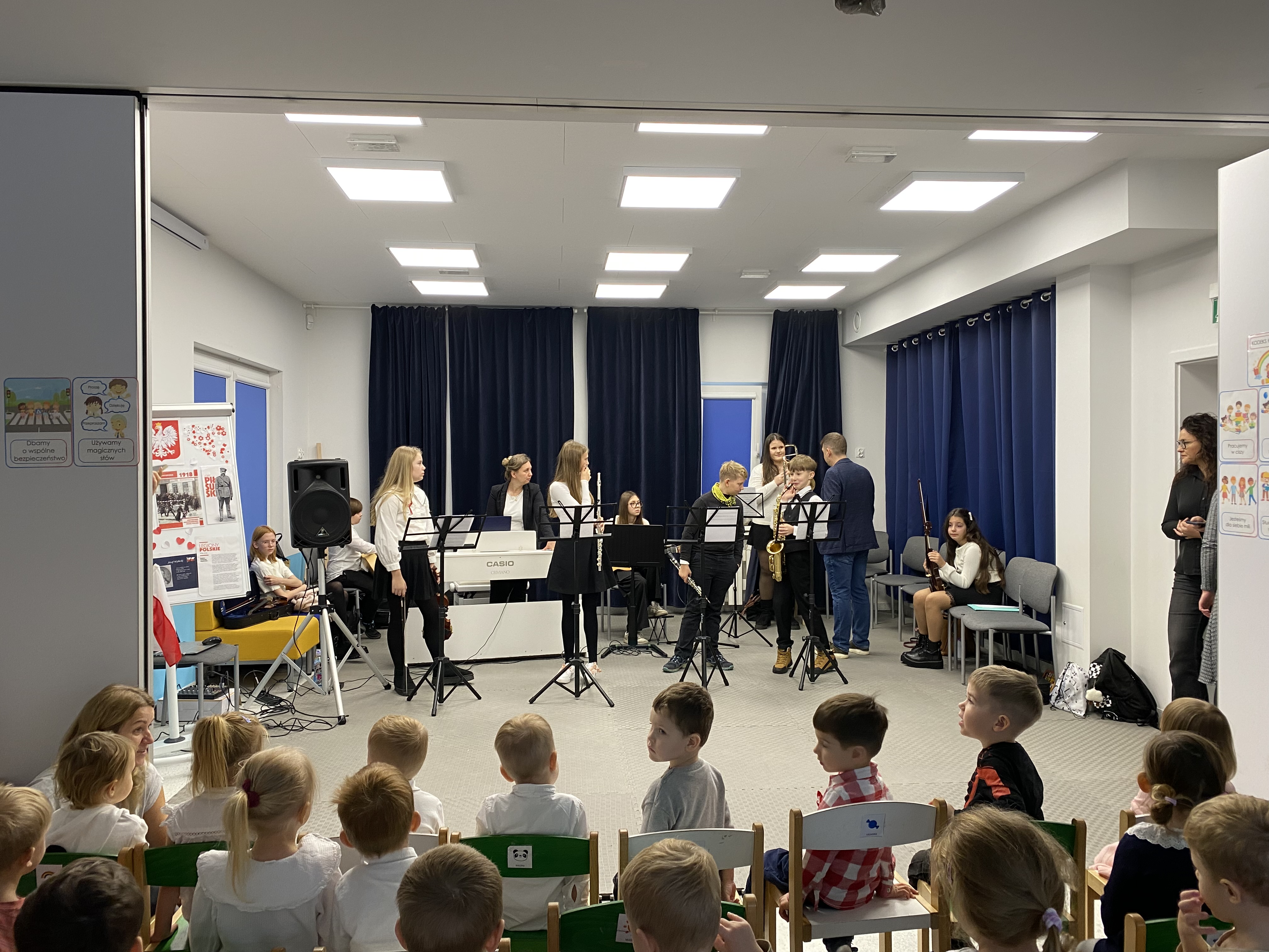 Z okazji obchodów Narodowego Święta Niepodległości – 11 listopada, dziś mieliśmy zaszczyt gościć w naszej społeczności uczniów i nauczycieli Niepublicznej Szkoły Muzycznej I stopnia "Artis" w Kowalach, którzy przygotowali wyjątkowy koncert. Młodzi artyści zaprezentowali piękny, patriotyczny repertuar, pełen wzruszających melodii i utworów niosących ducha wolności. Ich występ dostarczył publiczności wielu emocji i był wspaniałym uzupełnieniem obchodów tego ważnego dla nas wszystkich dnia. Serdeczne podziękowania Szkole Muzycznej"Artis" za obecność, zaangażowanie i wspaniałe muzyczne przeżycia!