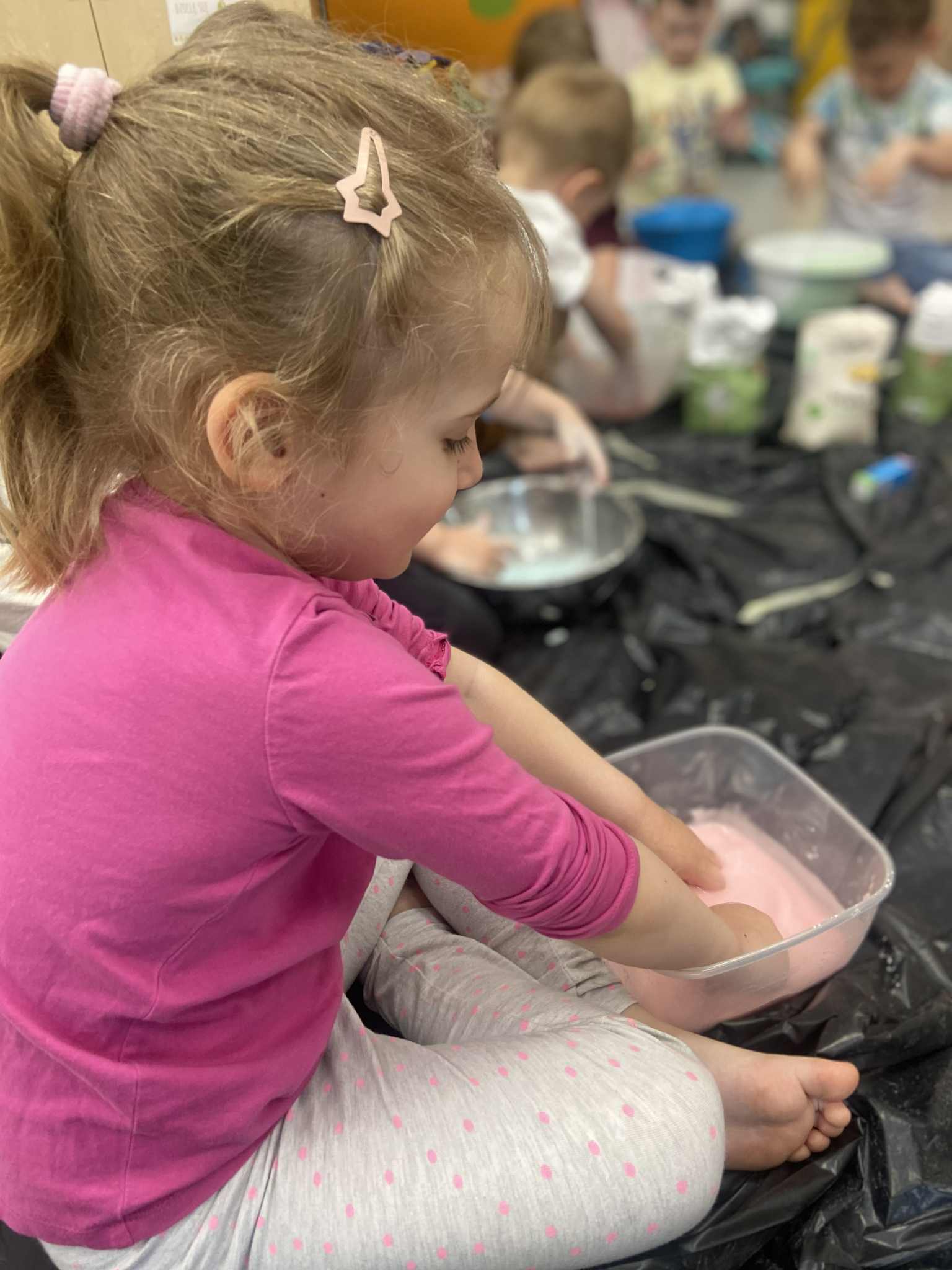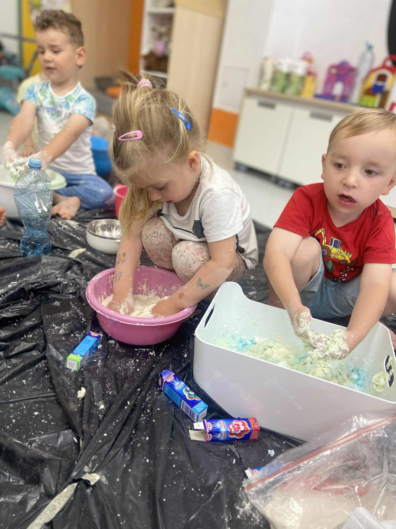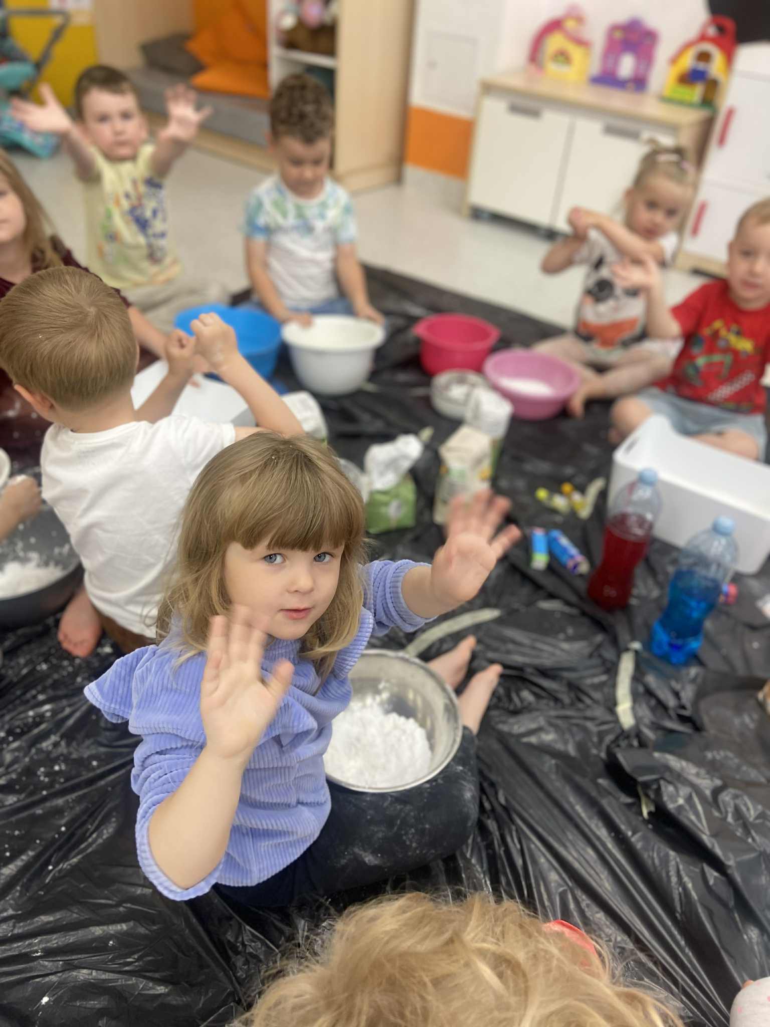 Zajęcia przebiegały w atmosferze radości i pełnej akceptacji – dzieci mogły się brudzić, mieszać, ugniatać i eksplorować bez ograniczeń. To była prawdziwa uczta dla zmysłów i fantastyczna przygoda!
