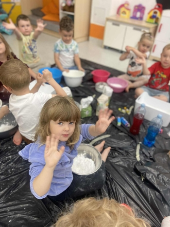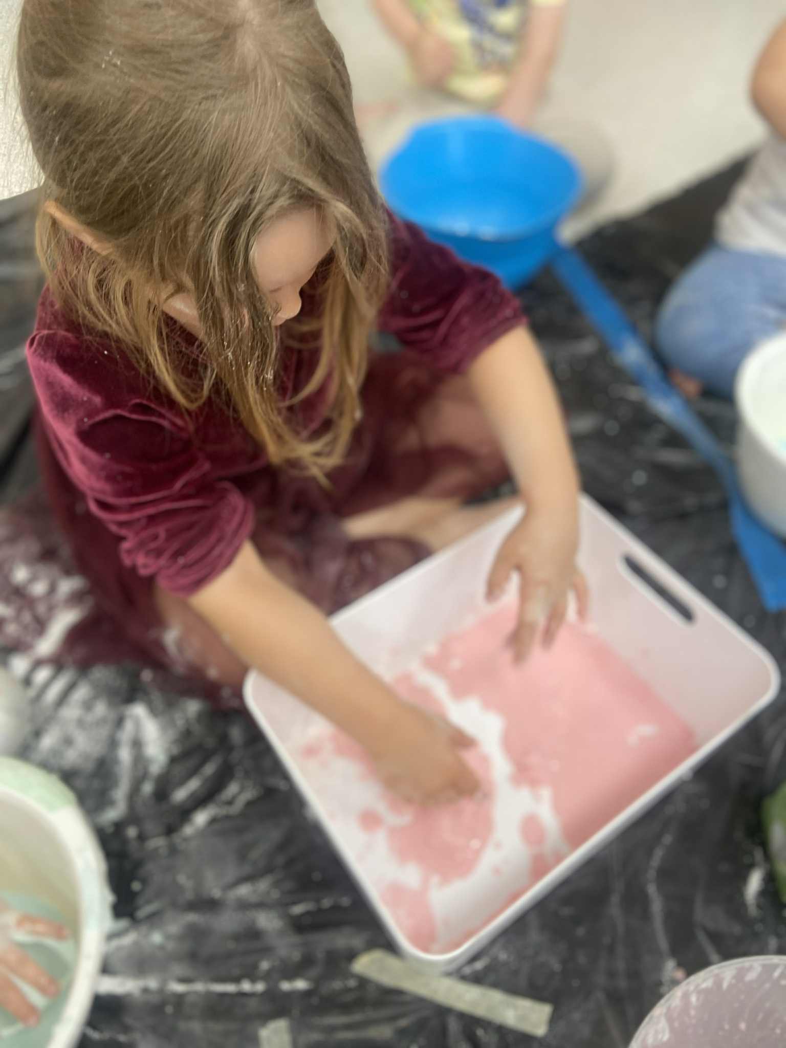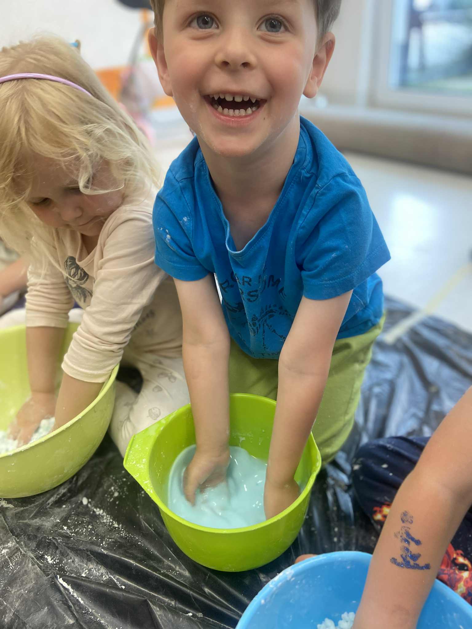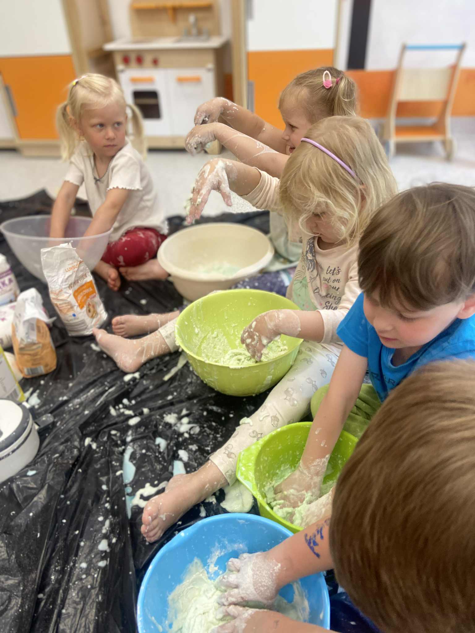 Zajęcia przebiegały w atmosferze radości i pełnej akceptacji – dzieci mogły się brudzić, mieszać, ugniatać i eksplorować bez ograniczeń. To była prawdziwa uczta dla zmysłów i fantastyczna przygoda!