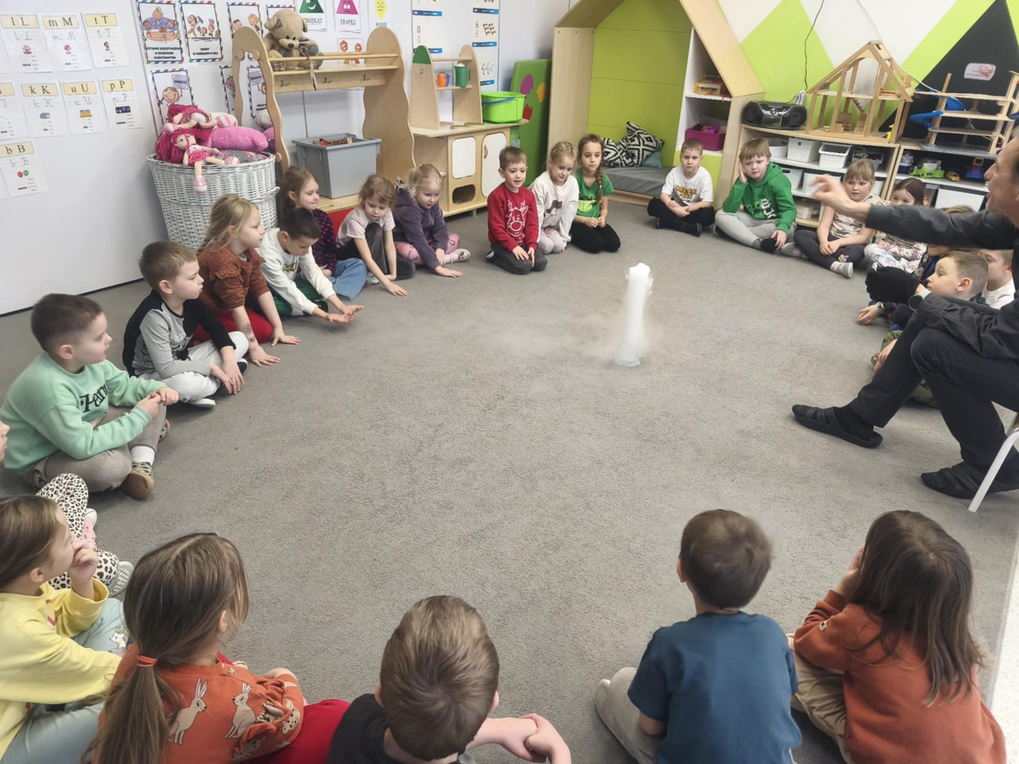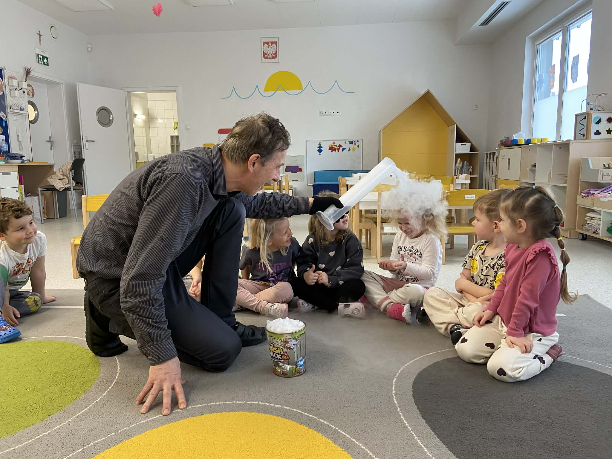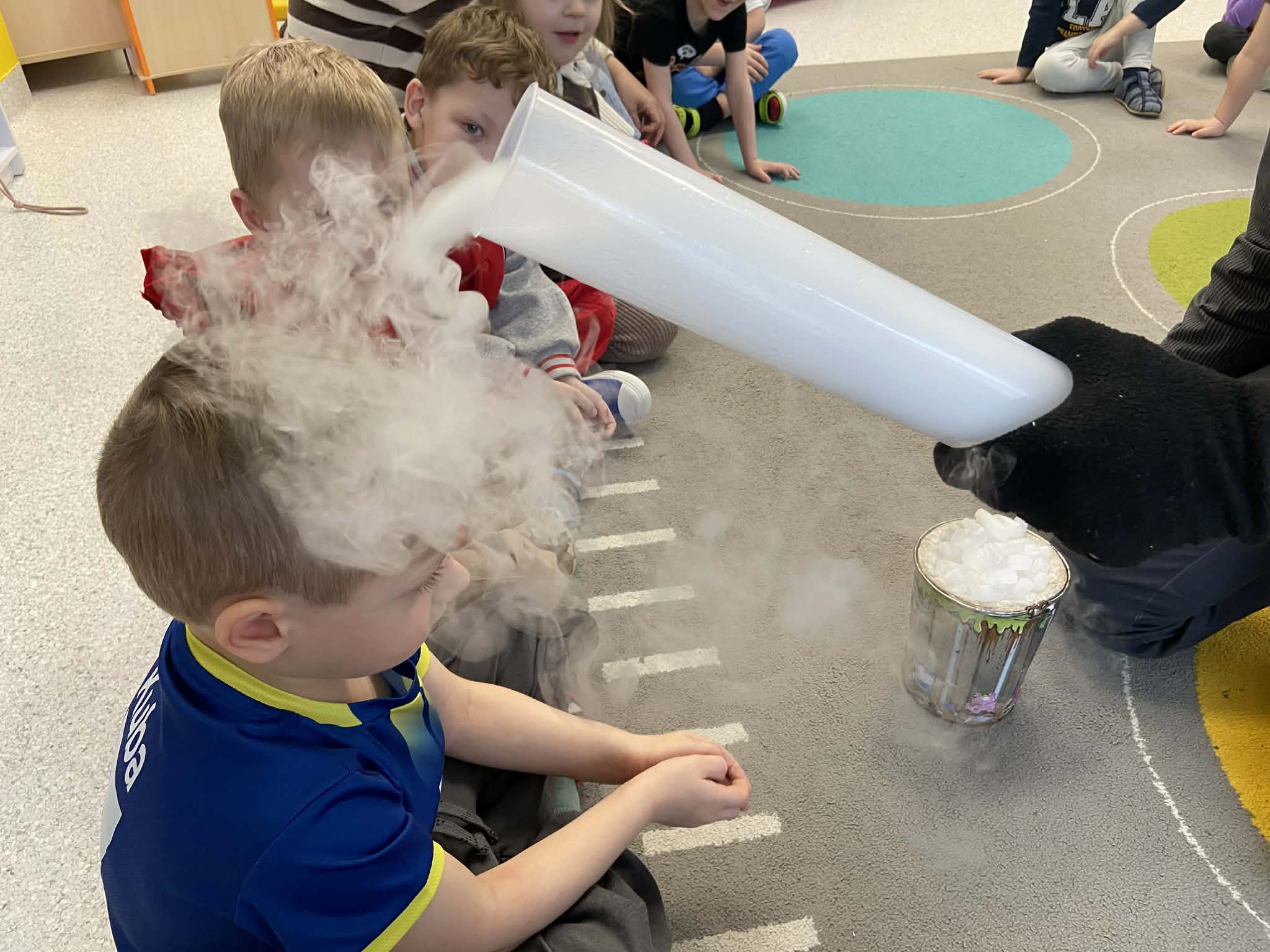 Podczas ostatnich zajęć z eksperymentów nasze przedszkolaki przeniosły się do niezwykłego, niemal bajkowego świata. Tematem spotkania z naszym gościem - Panem Krzysztofem, był „Gaz otrzymywany z suchego lodu, czyli jak to jest być w chmurach”.