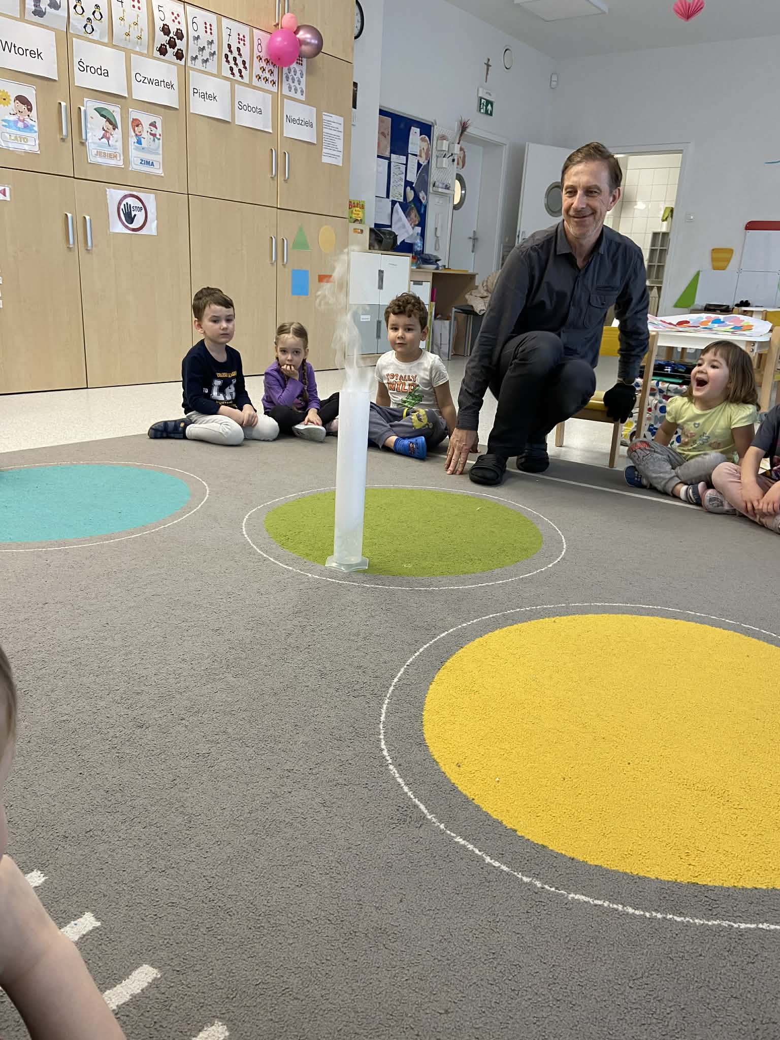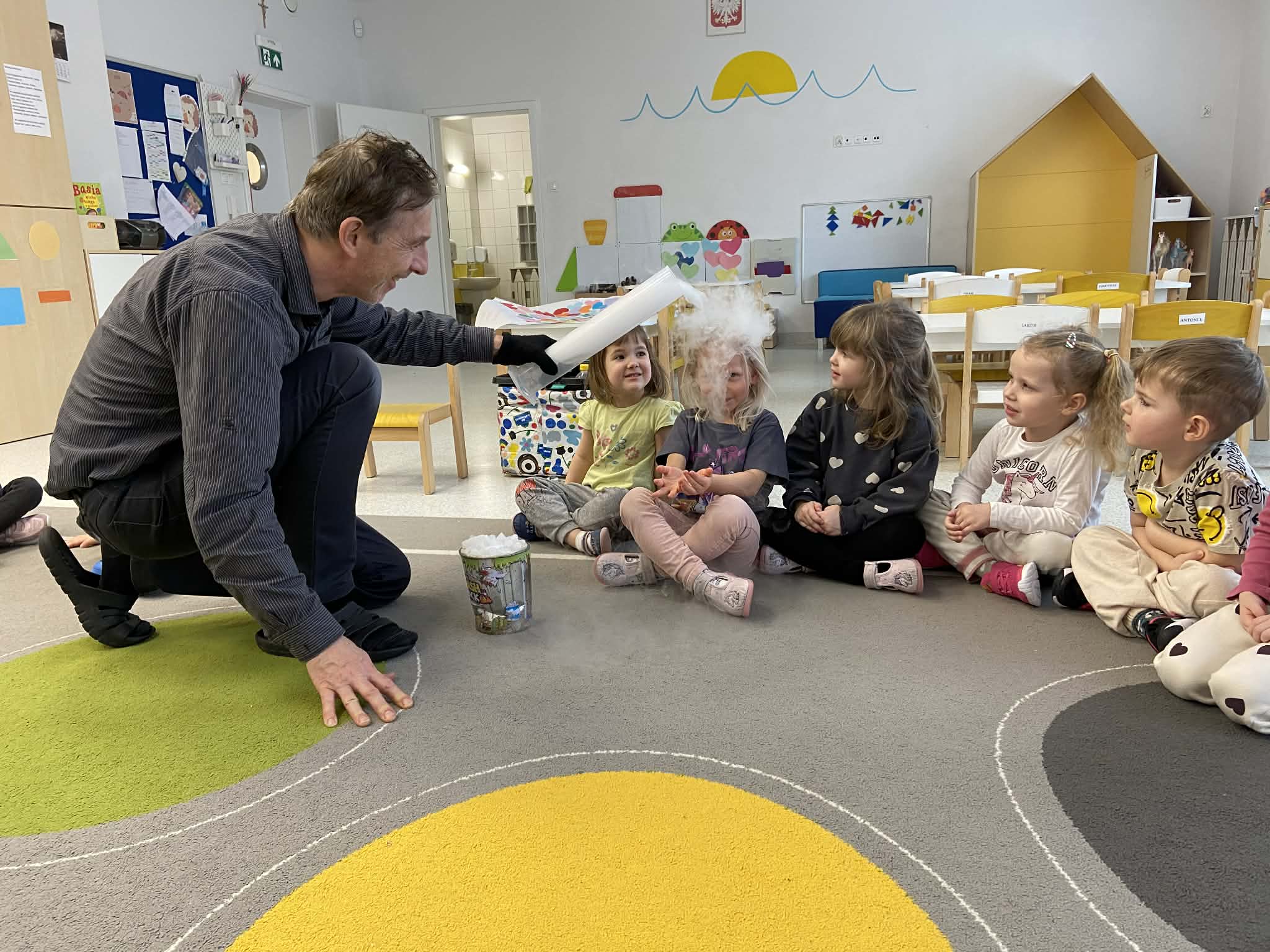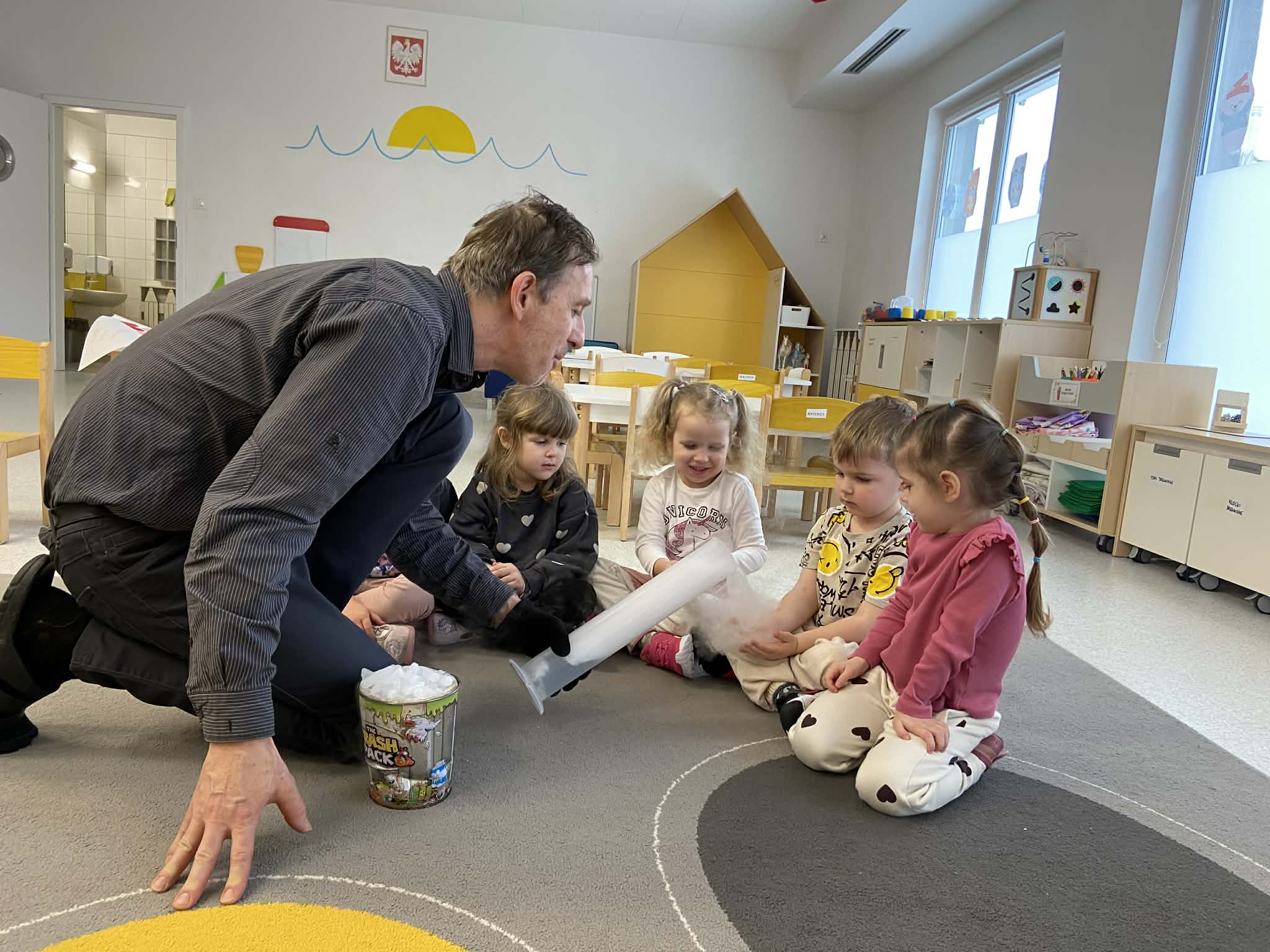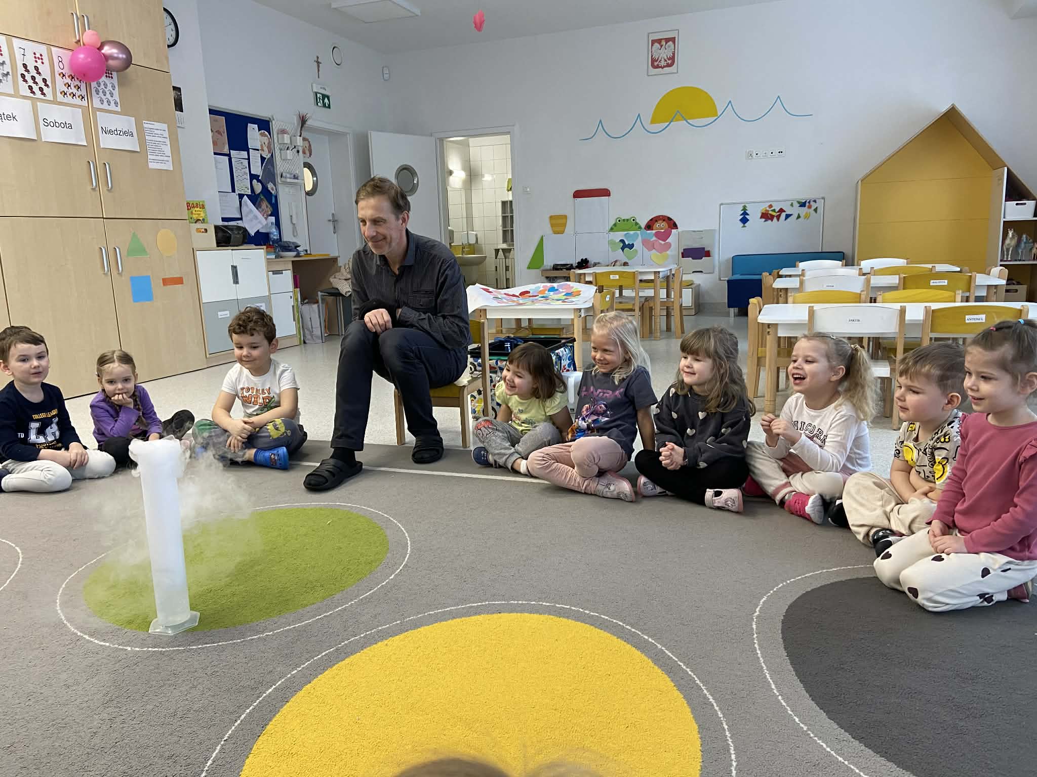Podczas ostatnich zajęć z eksperymentów nasze przedszkolaki przeniosły się do niezwykłego, niemal bajkowego świata. Tematem spotkania z naszym gościem - Panem Krzysztofem, był „Gaz otrzymywany z suchego lodu, czyli jak to jest być w chmurach”.
