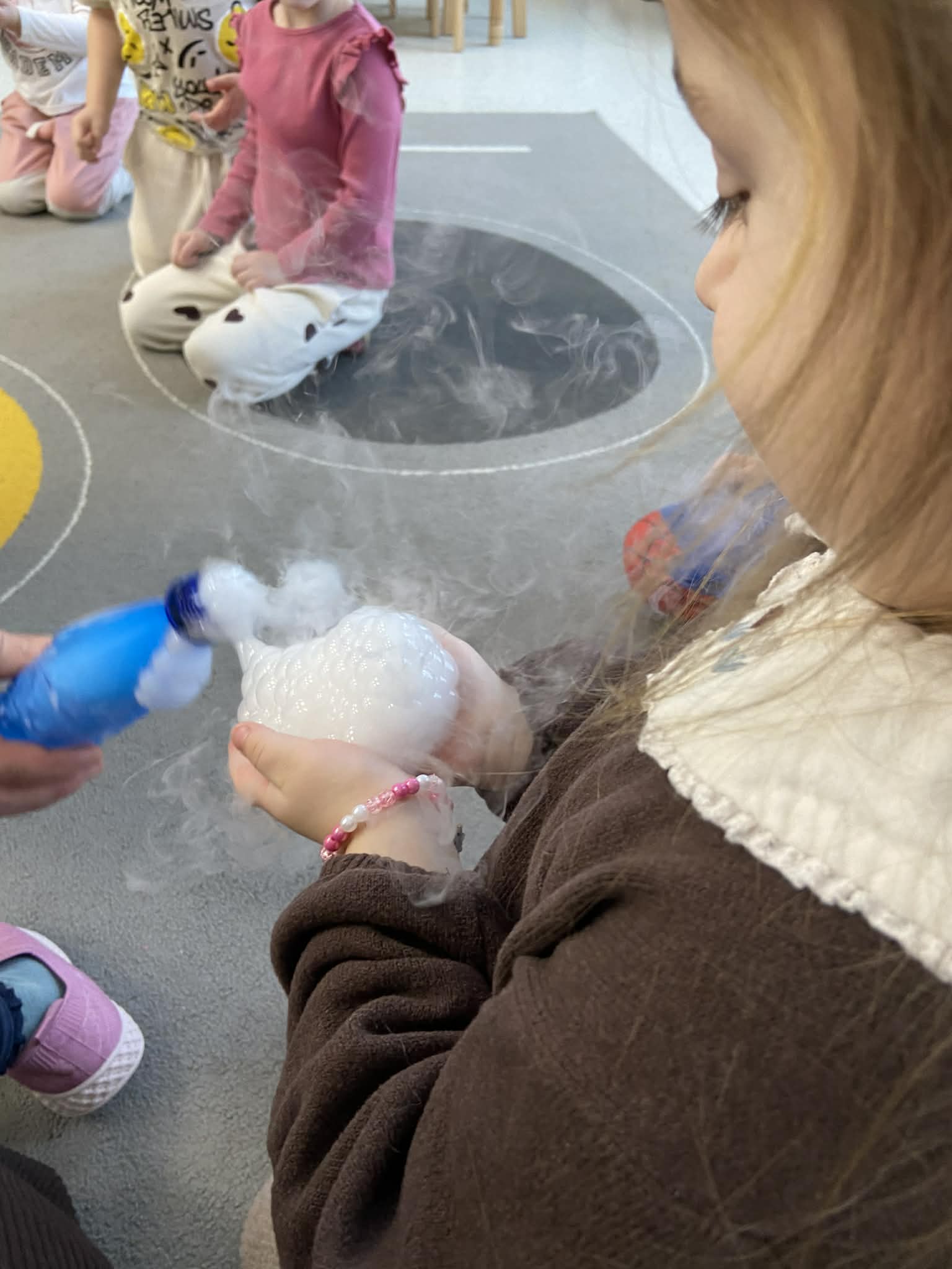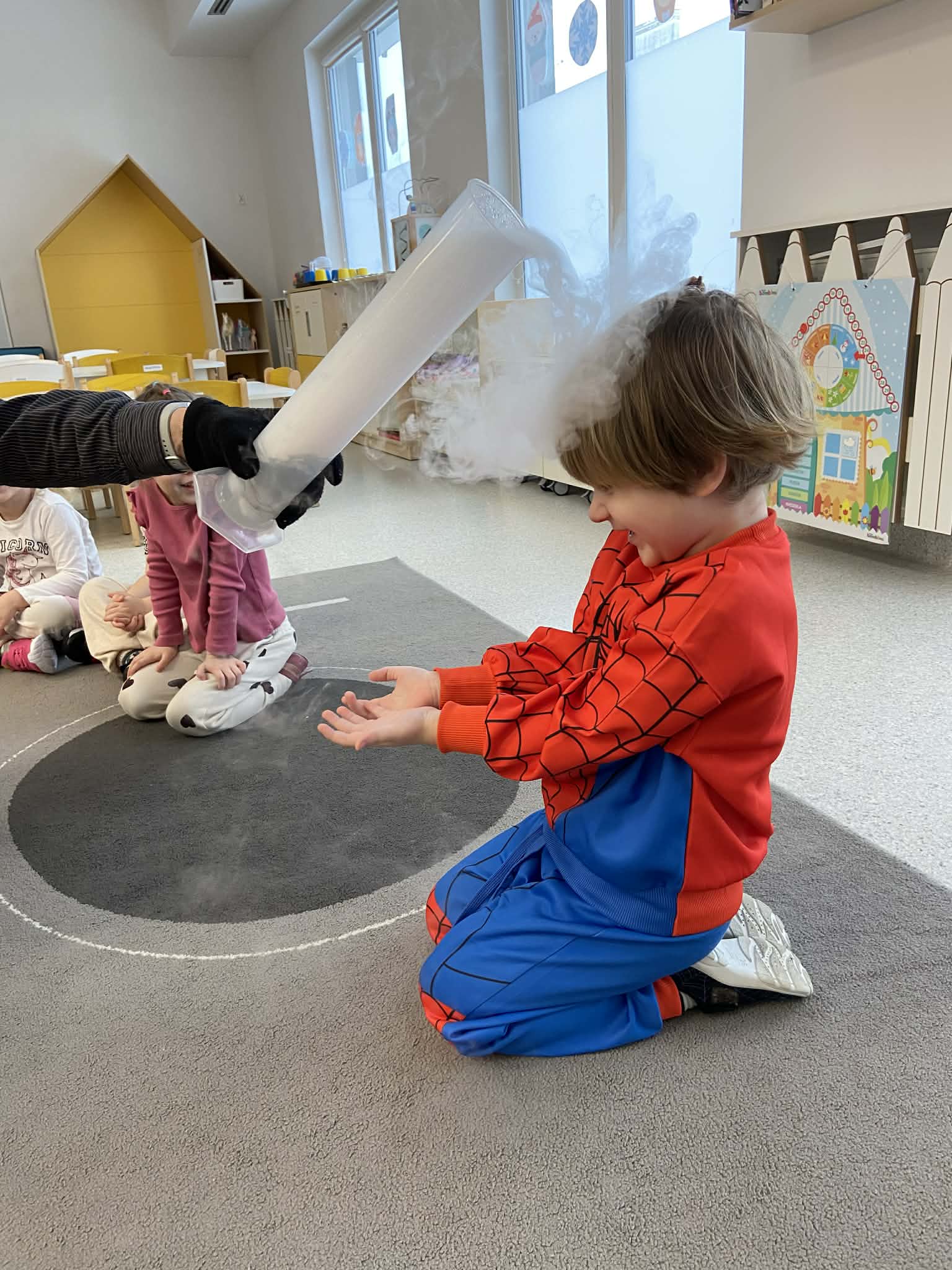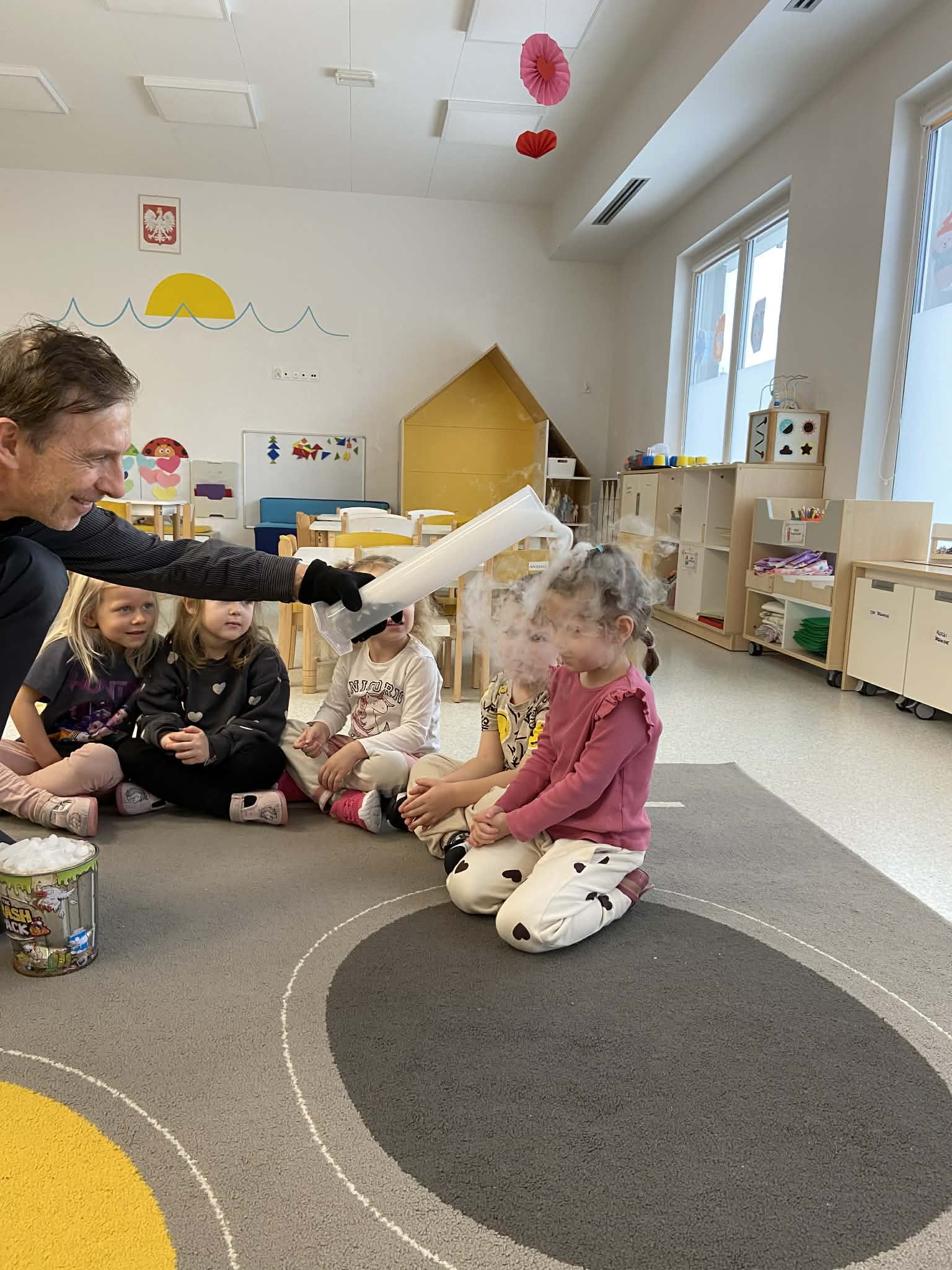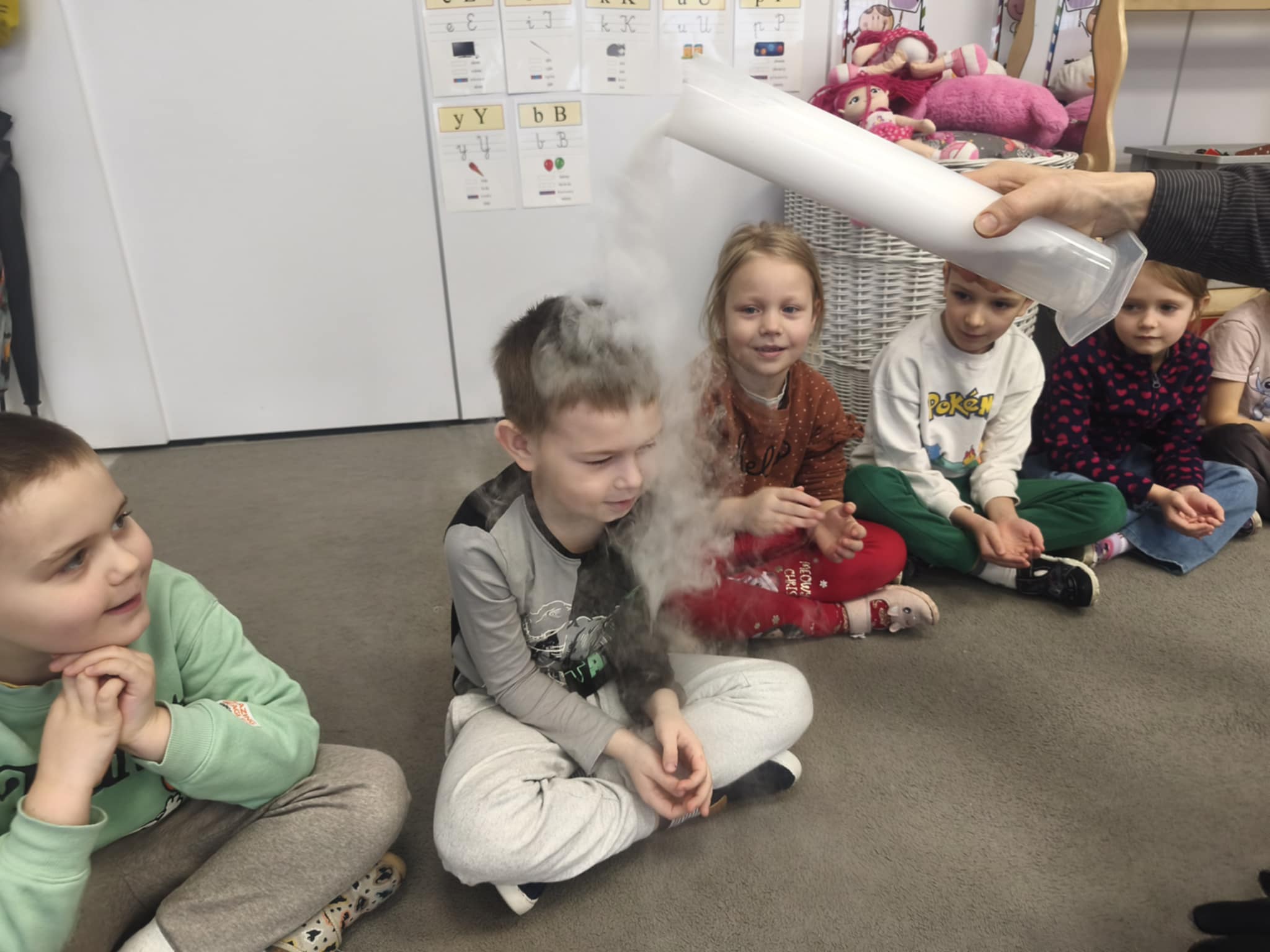 Dzieci z ogromnym zaciekawieniem obserwowały, jak suchy lód w kontakcie z ciepłą wodą zamienia się w tajemniczą, gęstą mgłę. Sala wypełniła się „chmurami”, a na twarzach dzieci pojawiły się uśmiechy i okrzyki zachwytu. To była doskonała okazja, aby porozmawiać o stanach skupienia, gazach oraz zjawiskach, które na co dzień możemy obserwować w przyrodzie. Największą radość sprawiła możliwość „zanurzenia rączek w chmurach” i obserwowania, jak mgła delikatnie opada i wiruje. Dzieci nie tylko świetnie się bawiły, ale również rozwijały swoją ciekawość świata, umiejętność obserwacji i wyciągania wniosków. Jak zawsze podczas eksperymentów, wszystkie doświadczenia były przeprowadzane w bezpiecznych warunkach i pod czujnym okiem nauczycieli.