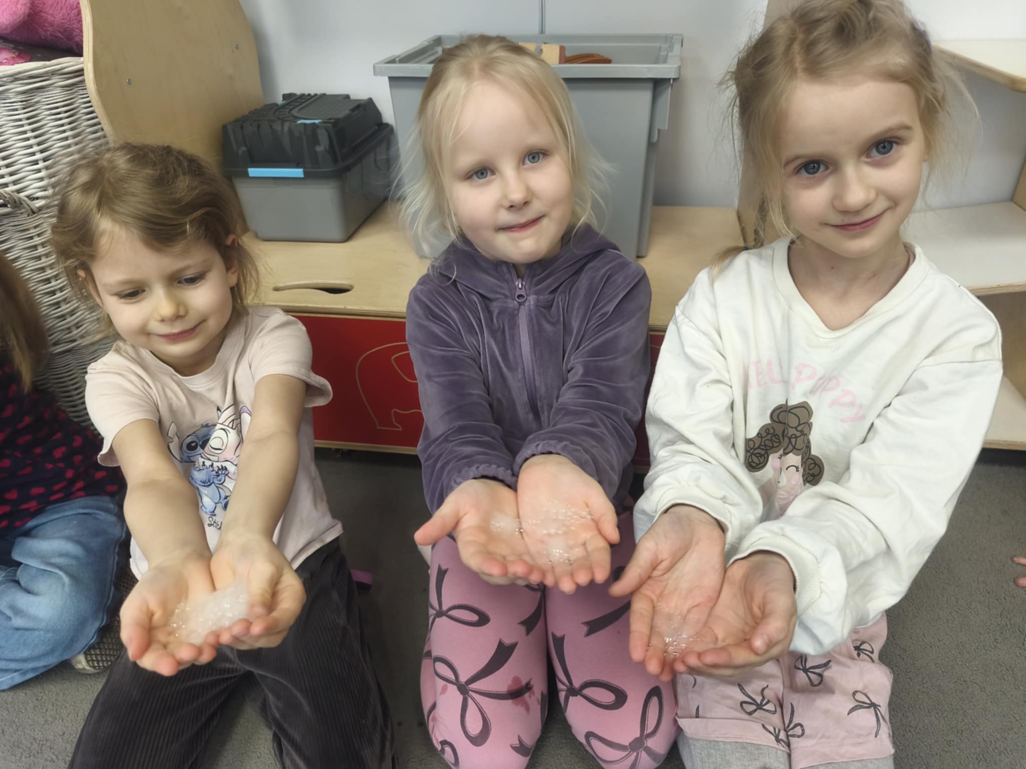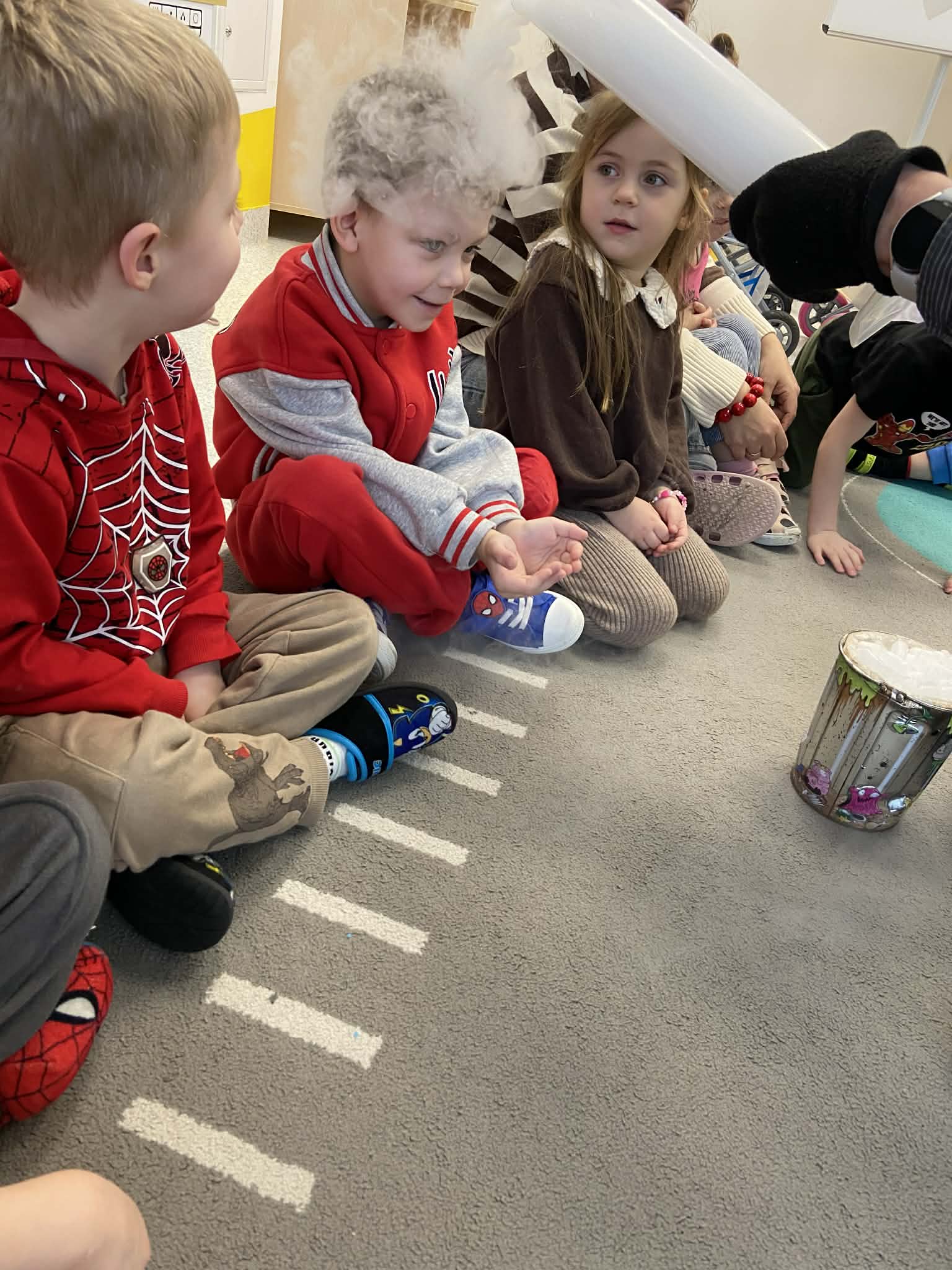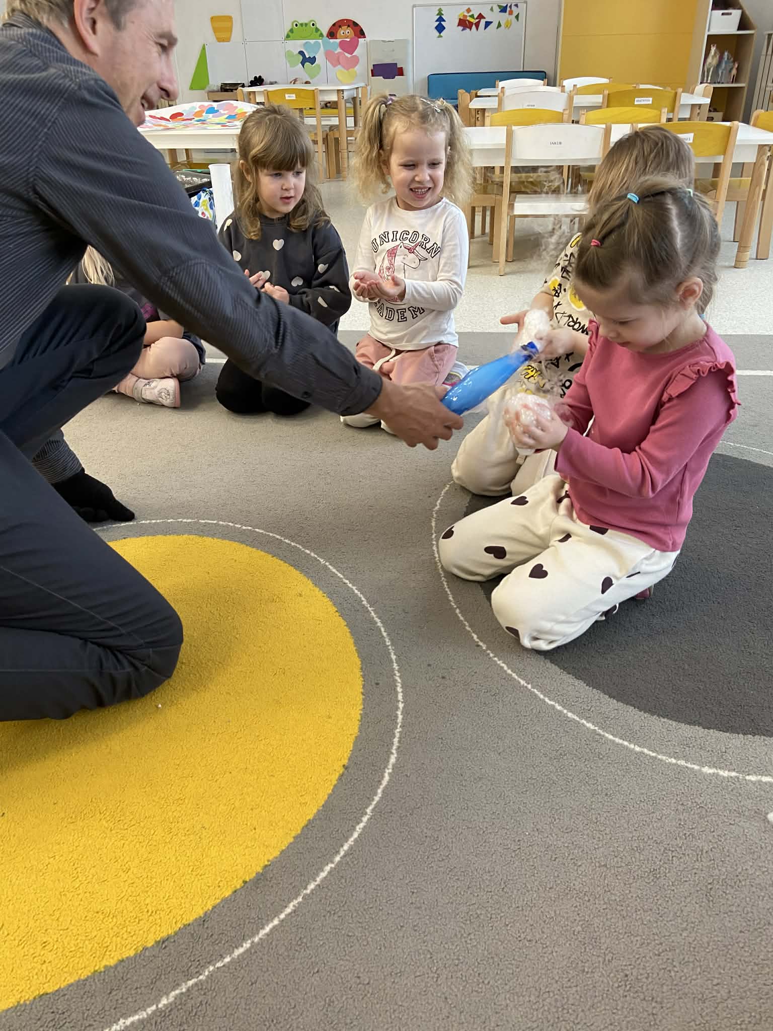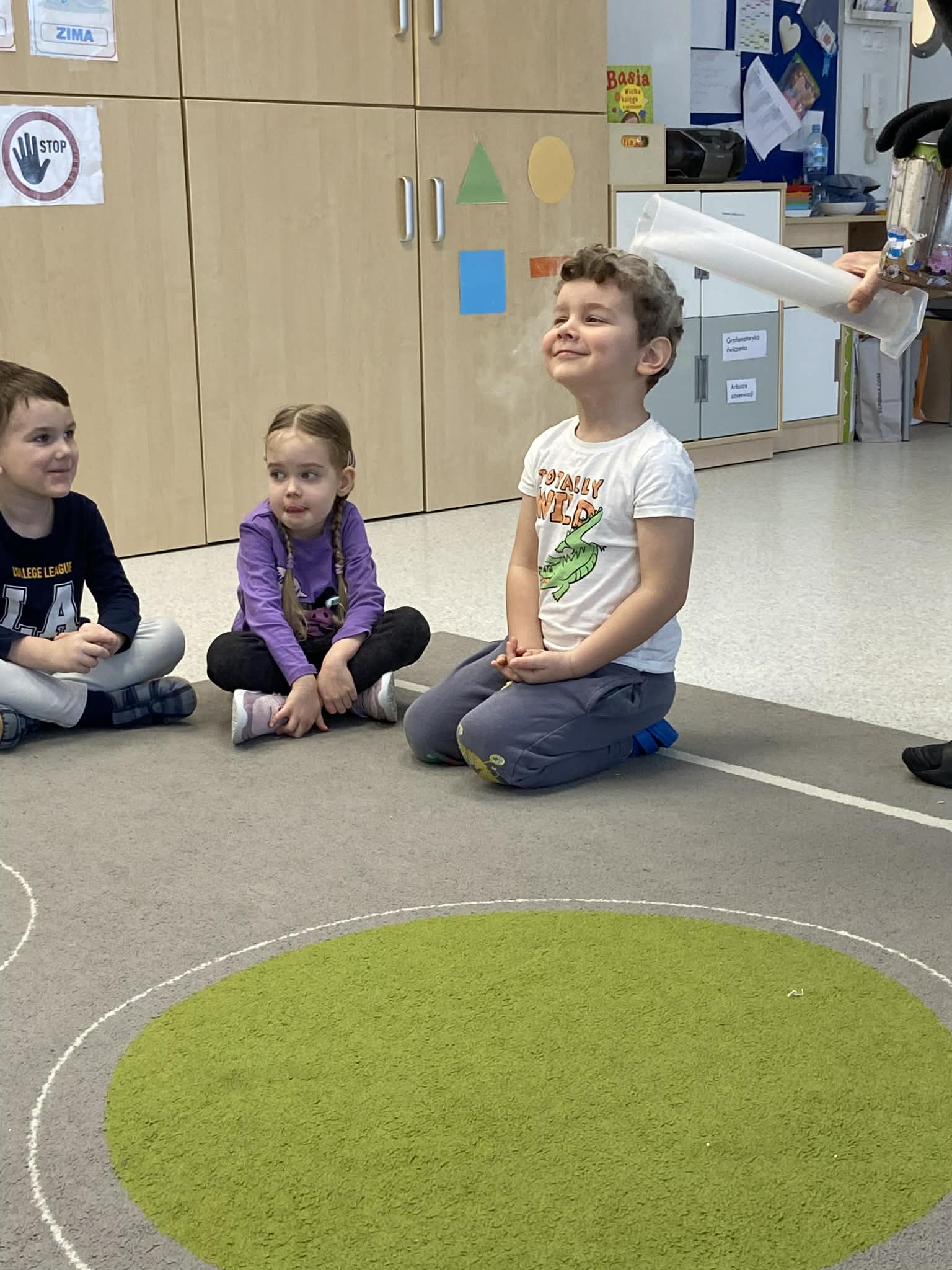 Dzieci z ogromnym zaciekawieniem obserwowały, jak suchy lód w kontakcie z ciepłą wodą zamienia się w tajemniczą, gęstą mgłę. Sala wypełniła się „chmurami”, a na twarzach dzieci pojawiły się uśmiechy i okrzyki zachwytu. To była doskonała okazja, aby porozmawiać o stanach skupienia, gazach oraz zjawiskach, które na co dzień możemy obserwować w przyrodzie. Największą radość sprawiła możliwość „zanurzenia rączek w chmurach” i obserwowania, jak mgła delikatnie opada i wiruje. Dzieci nie tylko świetnie się bawiły, ale również rozwijały swoją ciekawość świata, umiejętność obserwacji i wyciągania wniosków. Jak zawsze podczas eksperymentów, wszystkie doświadczenia były przeprowadzane w bezpiecznych warunkach i pod czujnym okiem nauczycieli.