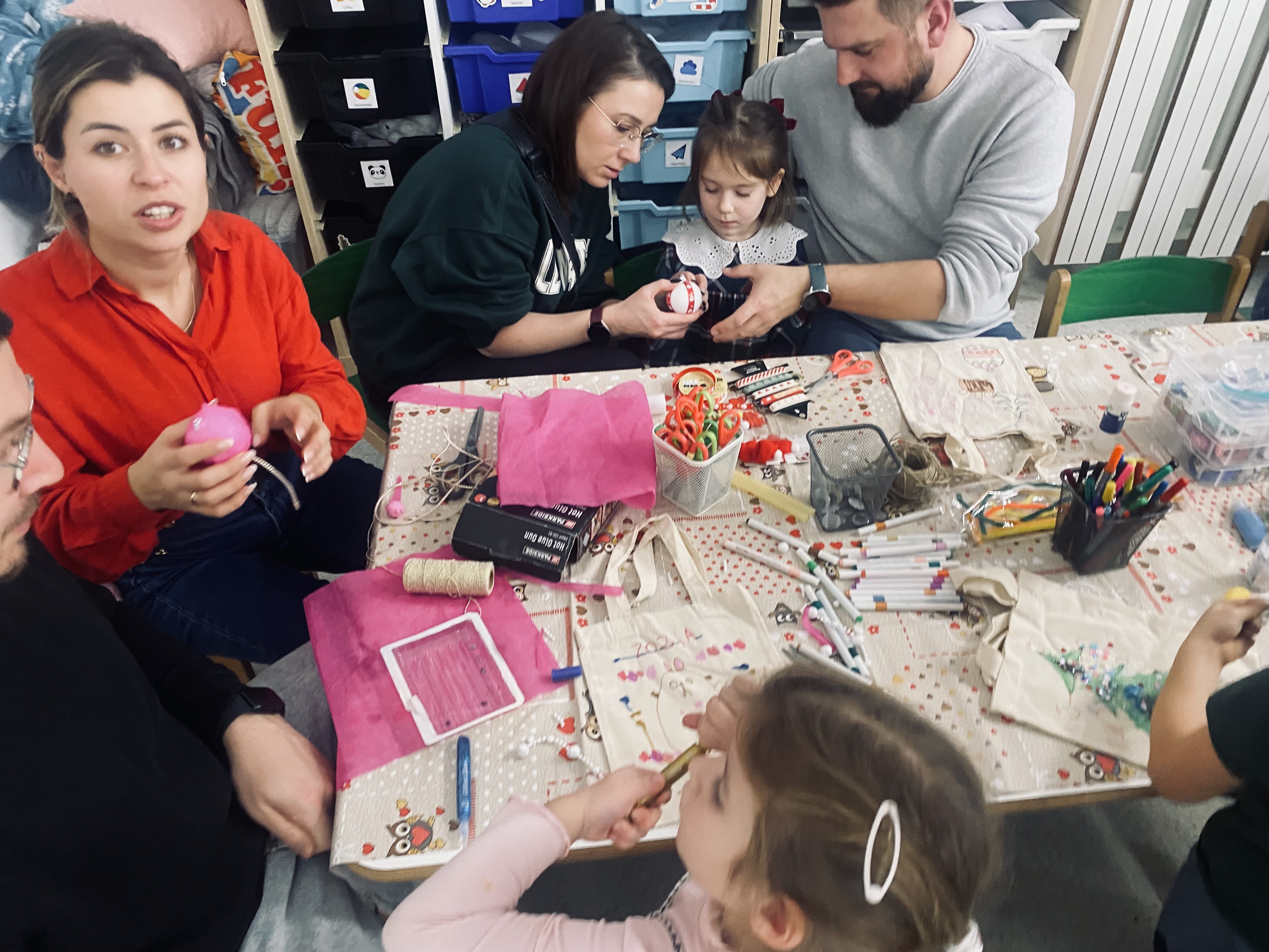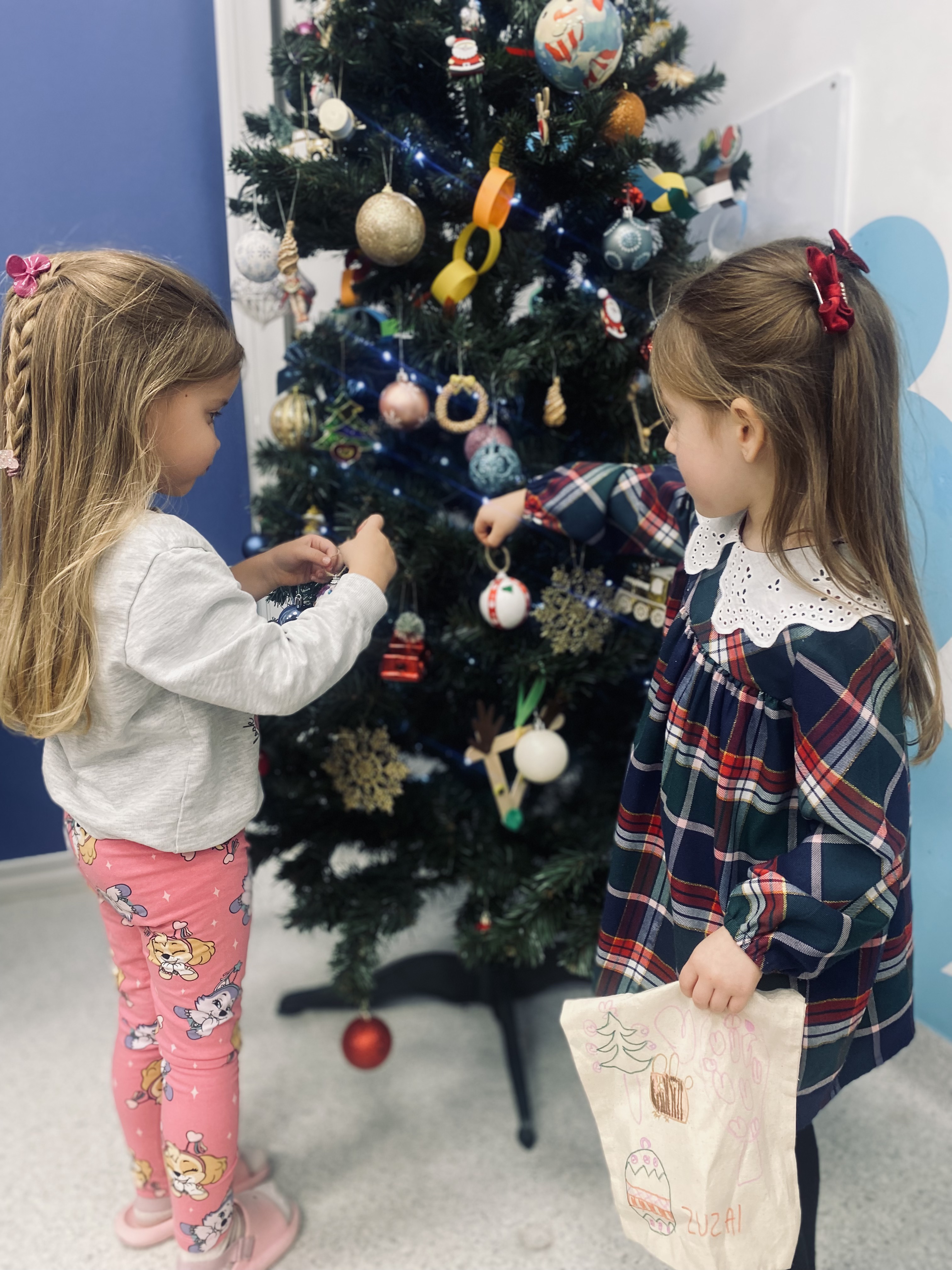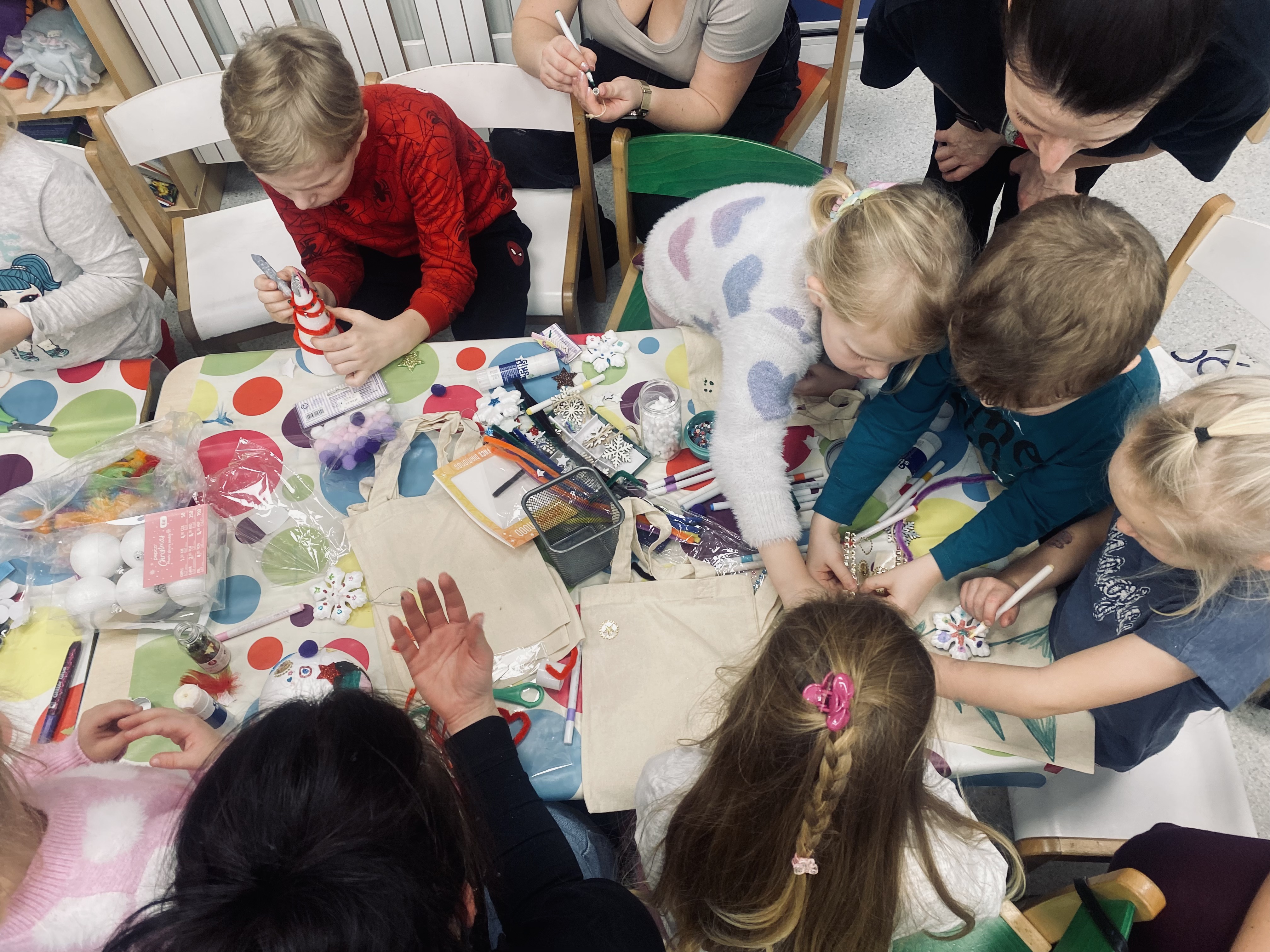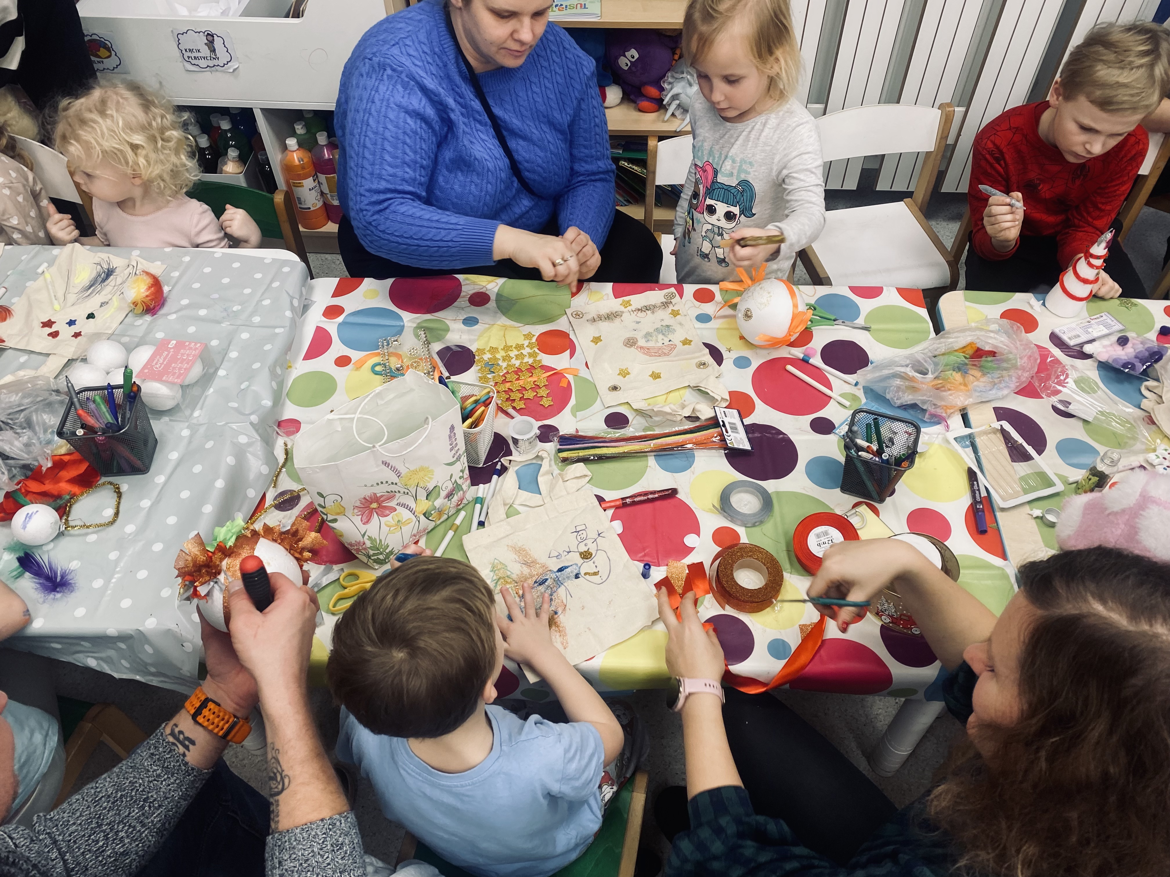 Podczas spotkania uczestnicy z wielkim zaangażowaniem tworzyli piękne bombki na choinkę, wykazując się kreatywnością i pomysłowością. Nie zabrakło również ozdabiania toreb w świąteczne motywy, które stały się wyjątkowymi, własnoręcznie wykonanymi dziełami sztuki.