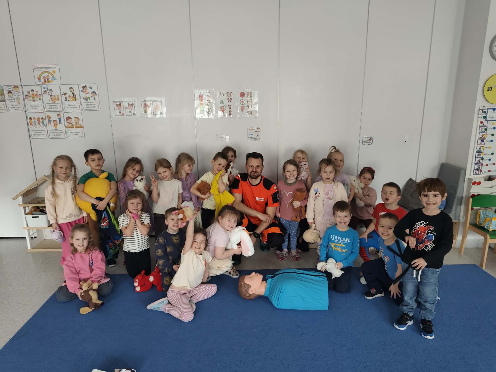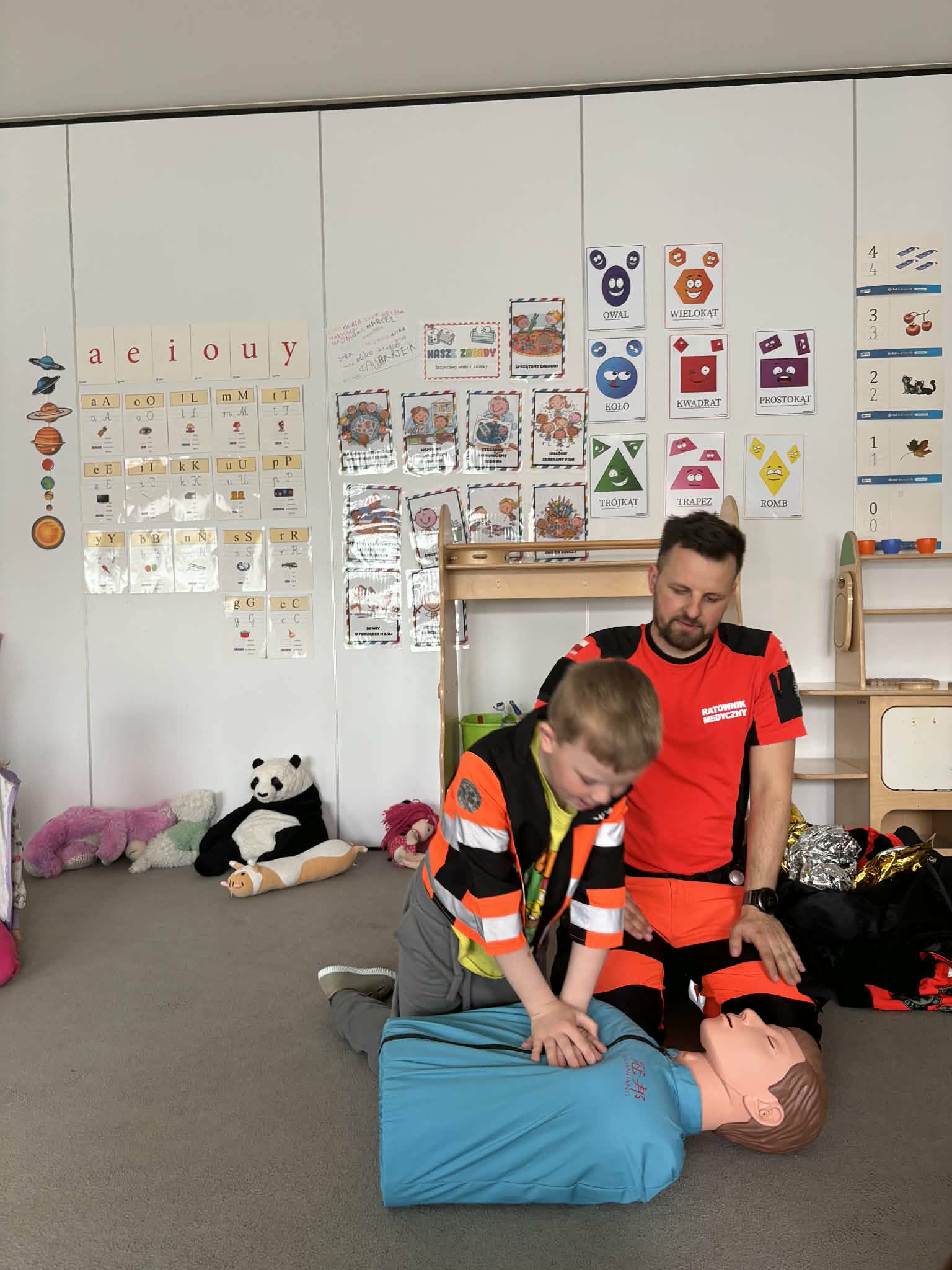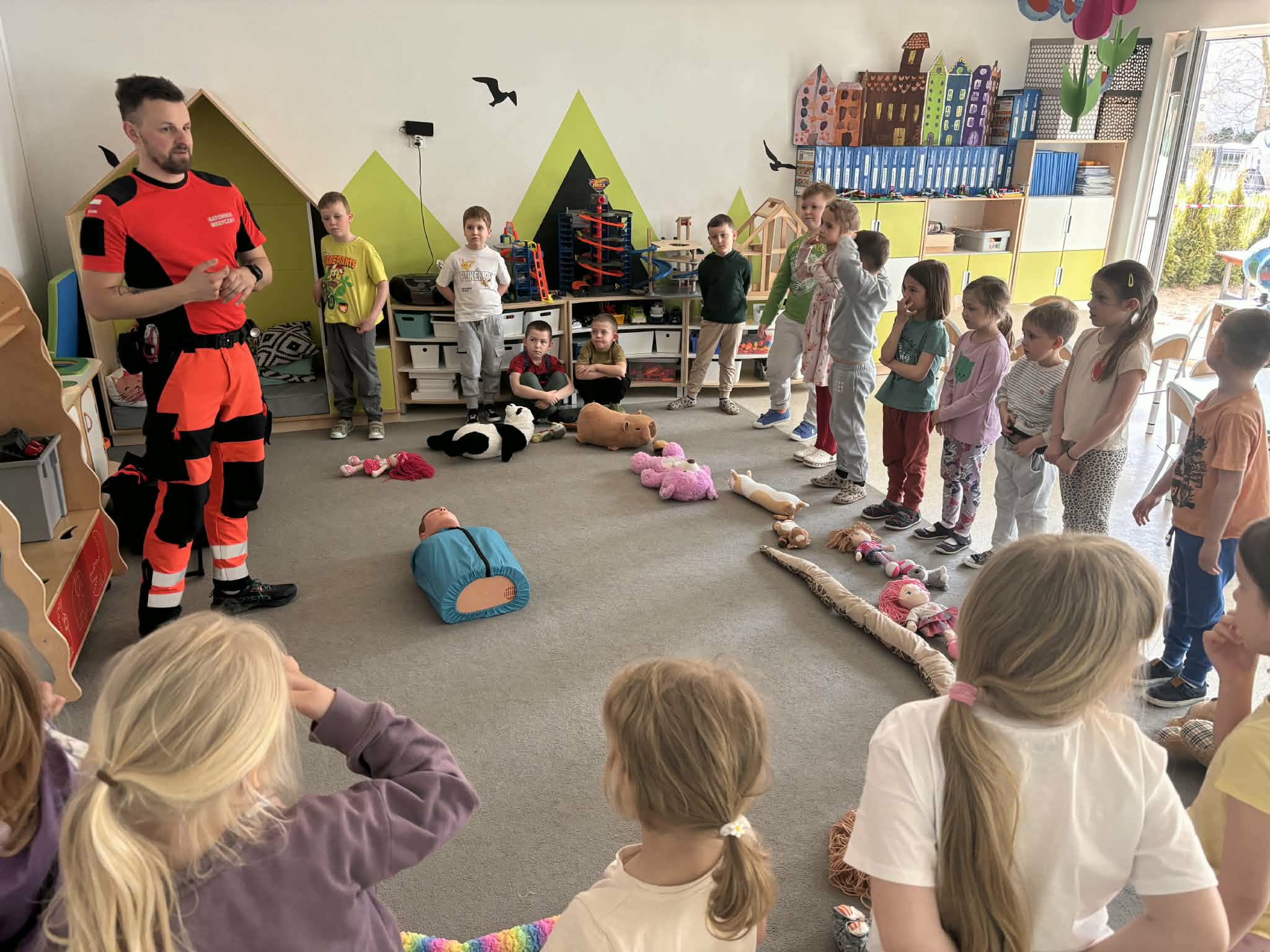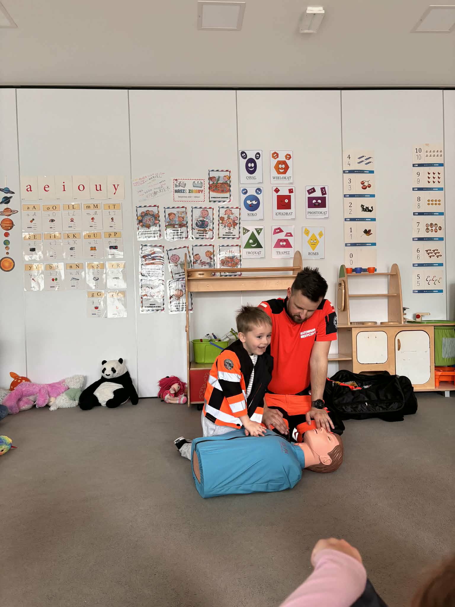 16 kwietnia w naszym przedszkolu odbyło się wyjątkowe i bardzo ważne spotkanie z ratownikiem medycznym. Była to doskonała okazja, aby dzieci mogły poznać zasady udzielania pierwszej pomocy oraz dowiedzieć się, jak należy zachować się w sytuacjach zagrożenia. Podczas zajęć przedszkolaki z dużym zainteresowaniem słuchały opowieści o pracy ratownika. Dowiedziały się, na czym polega jego odpowiedzialna rola oraz w jakich sytuacjach należy wezwać pomoc. Dzieci miały również możliwość zobaczenia z bliska sprzętu medycznego, a nawet spróbować swoich sił w prostych ćwiczeniach, takich jak sprawdzanie oddechu czy układanie poszkodowanego w pozycji bezpiecznej. Spotkanie było nie tylko bardzo ciekawe, ale przede wszystkim pouczające. Dzięki niemu dzieci zdobyły cenną wiedzę, która może pomóc im właściwie zareagować w trudnych sytuacjach.