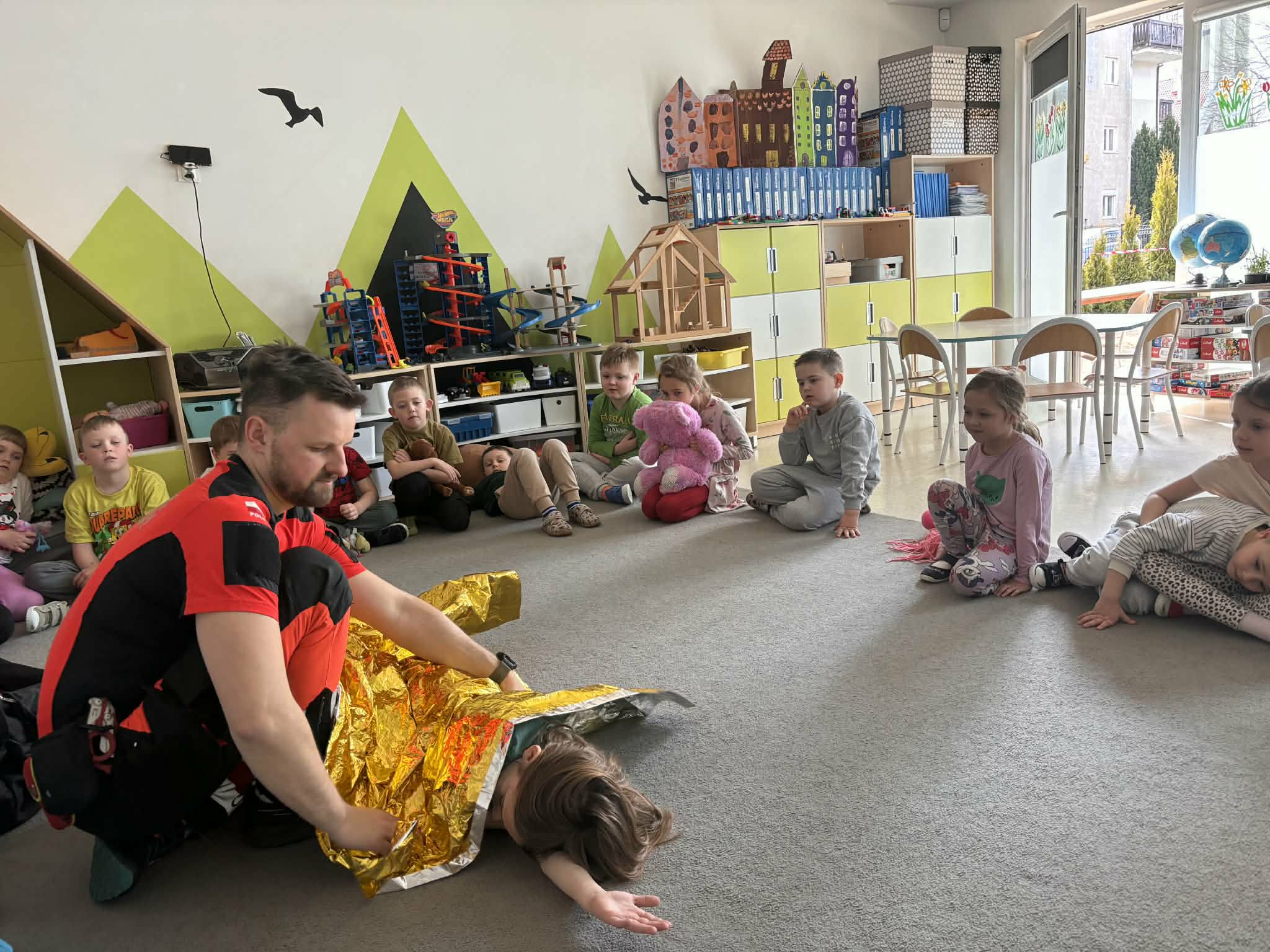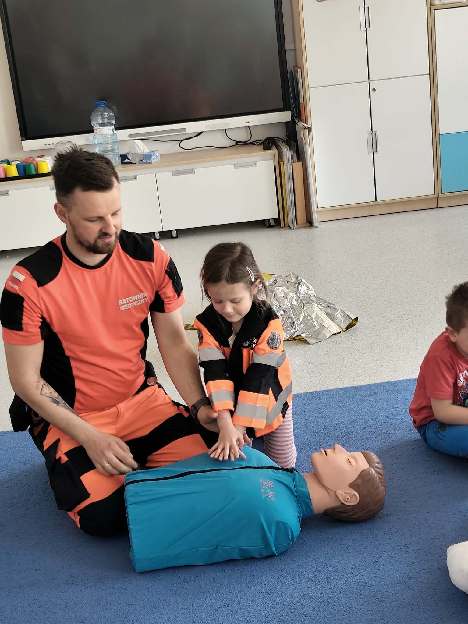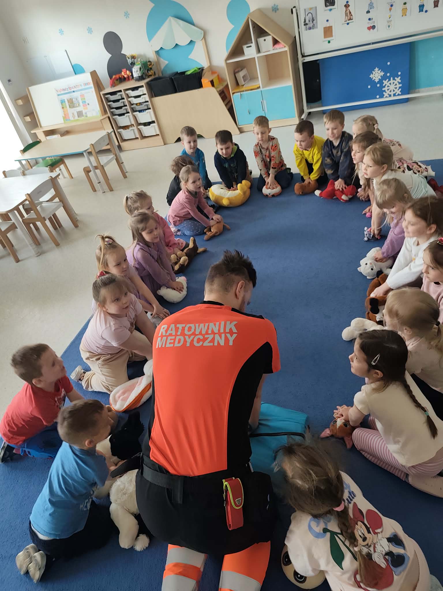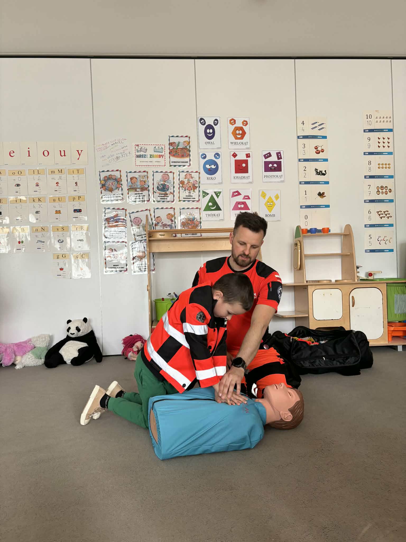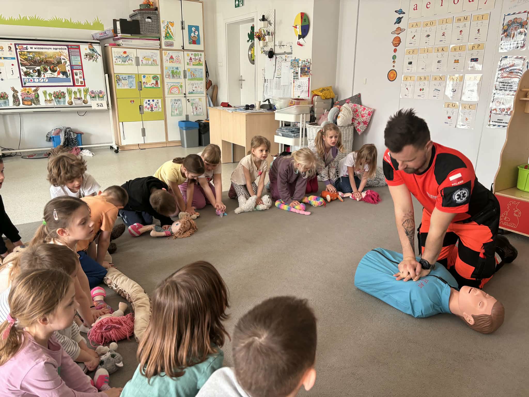 16 kwietnia w naszym przedszkolu odbyło się wyjątkowe i bardzo ważne spotkanie z ratownikiem medycznym. Była to doskonała okazja, aby dzieci mogły poznać zasady udzielania pierwszej pomocy oraz dowiedzieć się, jak należy zachować się w sytuacjach zagrożenia. Podczas zajęć przedszkolaki z dużym zainteresowaniem słuchały opowieści o pracy ratownika. Dowiedziały się, na czym polega jego odpowiedzialna rola oraz w jakich sytuacjach należy wezwać pomoc. Dzieci miały również możliwość zobaczenia z bliska sprzętu medycznego, a nawet spróbować swoich sił w prostych ćwiczeniach, takich jak sprawdzanie oddechu czy układanie poszkodowanego w pozycji bezpiecznej. Spotkanie było nie tylko bardzo ciekawe, ale przede wszystkim pouczające. Dzięki niemu dzieci zdobyły cenną wiedzę, która może pomóc im właściwie zareagować w trudnych sytuacjach.