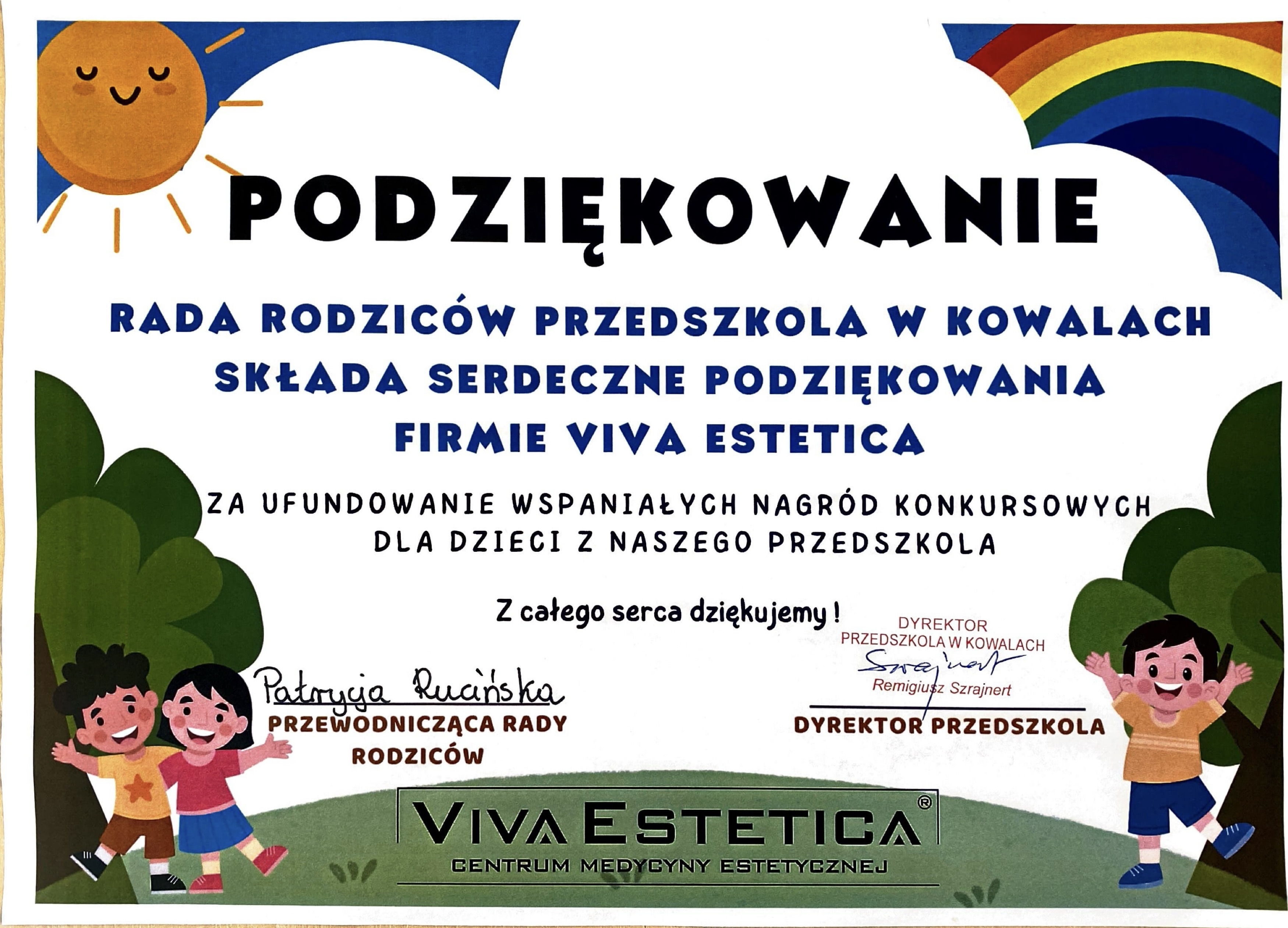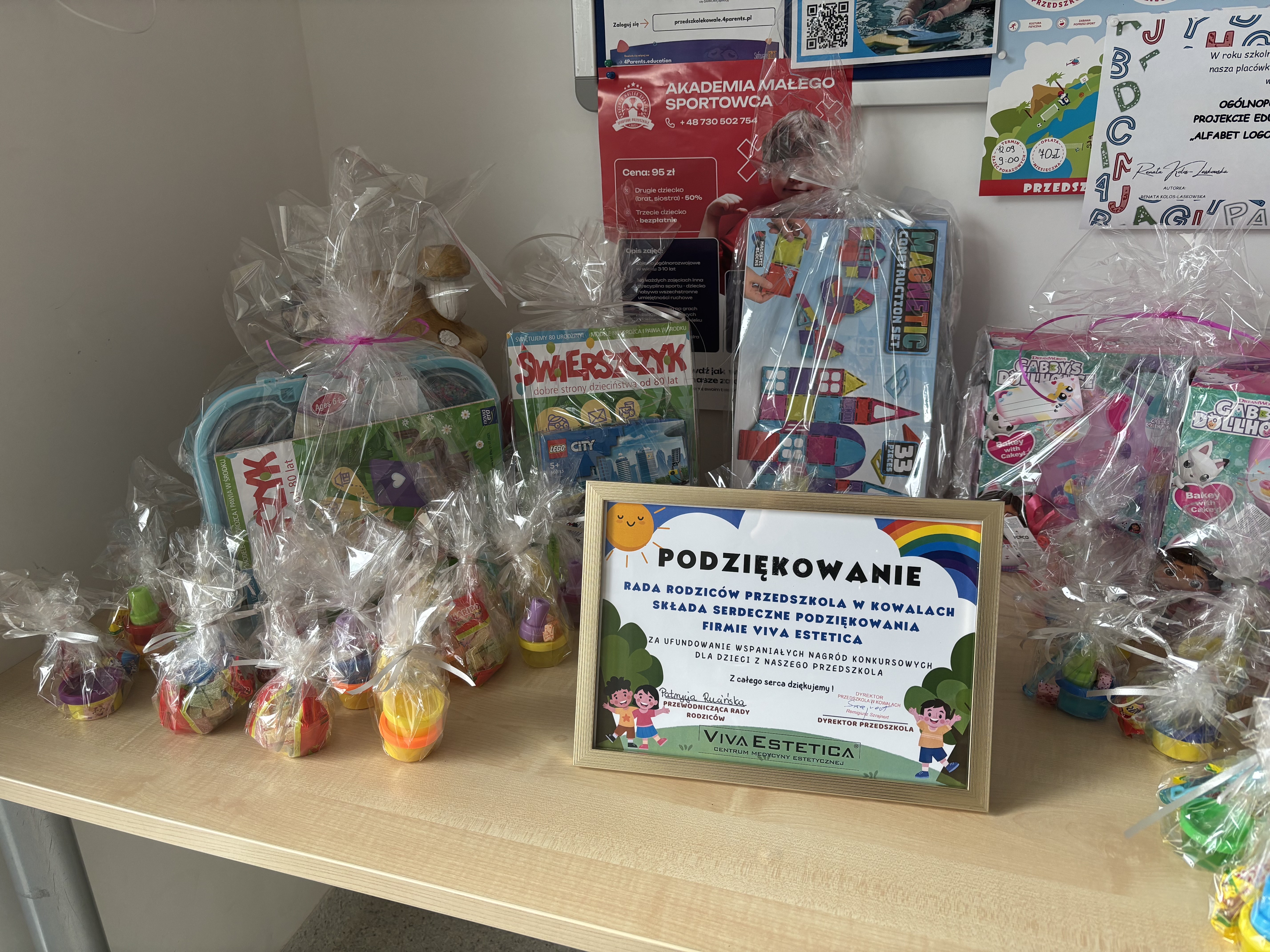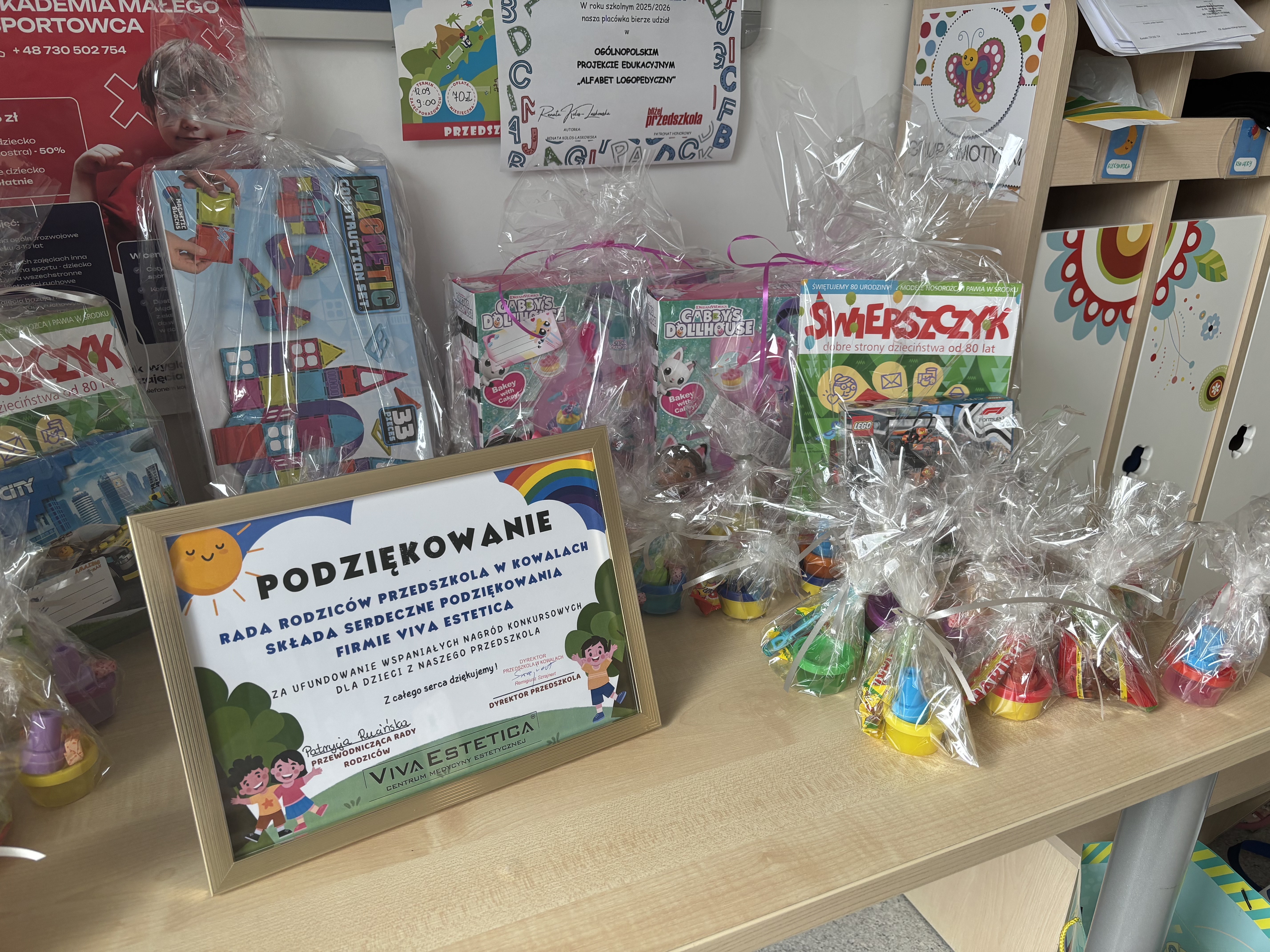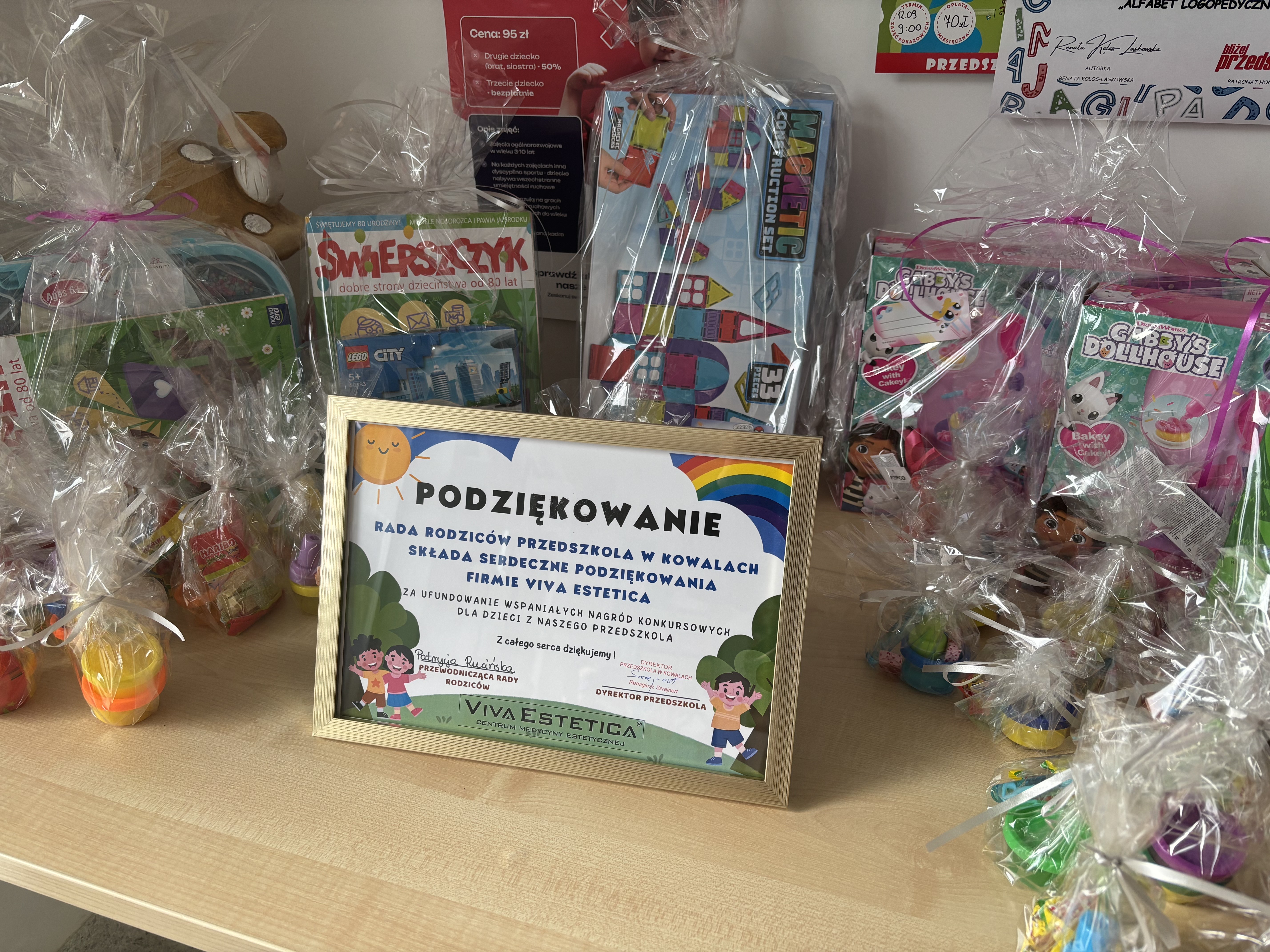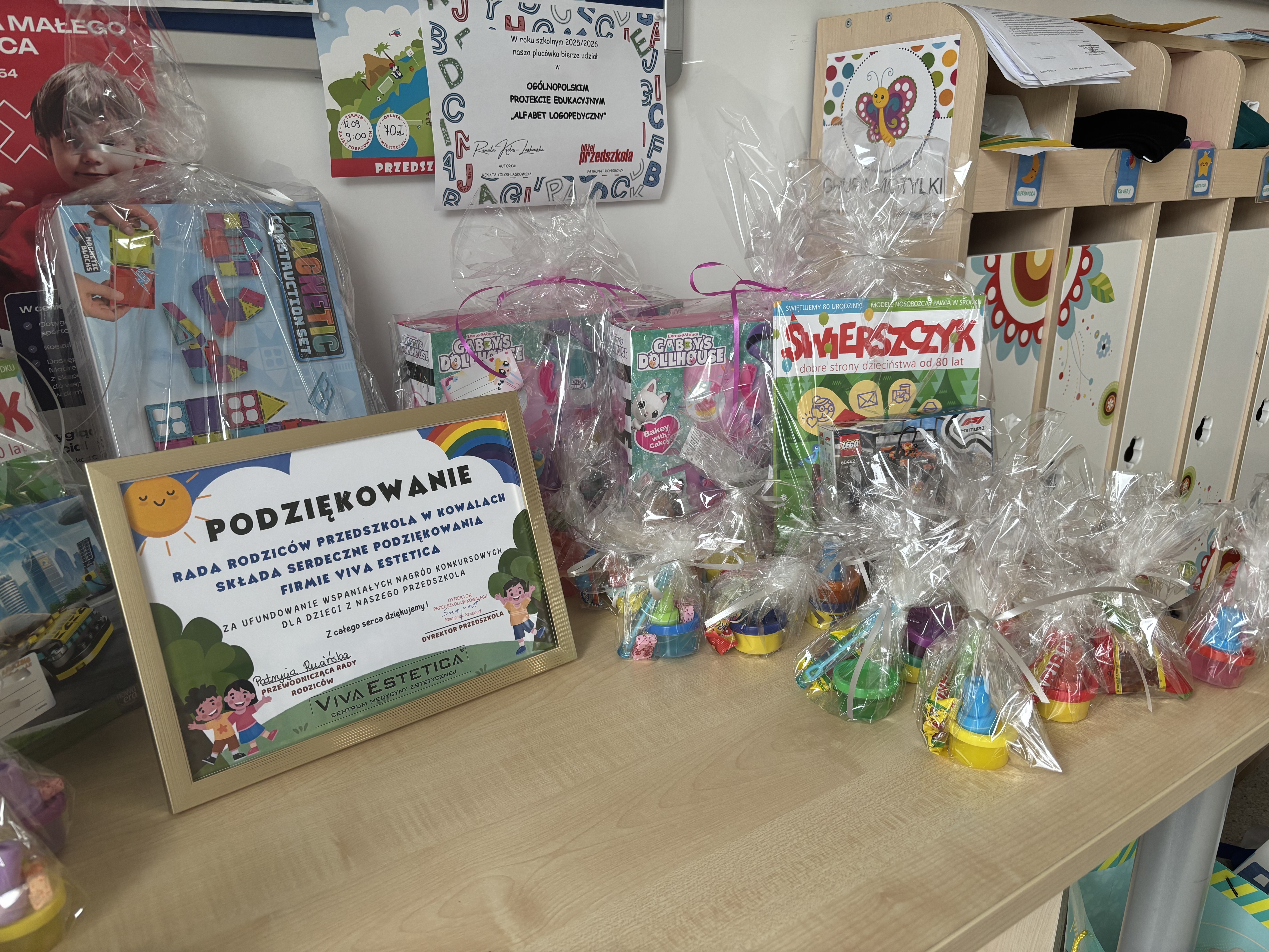 Składamy serdeczne podziękowania firmie Viva Estetica za ufundowanie nagród dla naszych wychowanków z okazji konkursu plastycznego. Dzięki Państwa życzliwości i zaangażowaniu mogliśmy sprawić dzieciom ogromną radość oraz stworzyć im dodatkową motywację do twórczej pracy. Otrzymane nagrody były wspaniałym uzupełnieniem naszego wydarzenia i przyczyniły się do jego wyjątkowego charakteru. Dziękujemy za okazaną pomoc, wsparcie oraz piękny gest, który na długo pozostanie w naszej pamięci. Dziękujemy również Radzie Rodziców za pomoc w przygotowaniu upominków. Gratulujemy wszystkim uczestnikom!